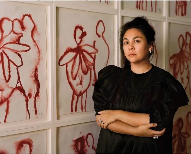 “在这个系列中肯定有一些作品,我认为人们会觉得它们可能是对当前形势的回应。因为我最初的灵感,在中央圣马丁学院时,是阿兰群岛人民的这个古老传统,妇女会把衬裙染成红色,并在葬礼队伍中戴在头上。我有一次差点把它们拿出来。然后我想不行,因为对我来说,它们代表了这种仪式的概念,但也代表了它的脆弱性。”