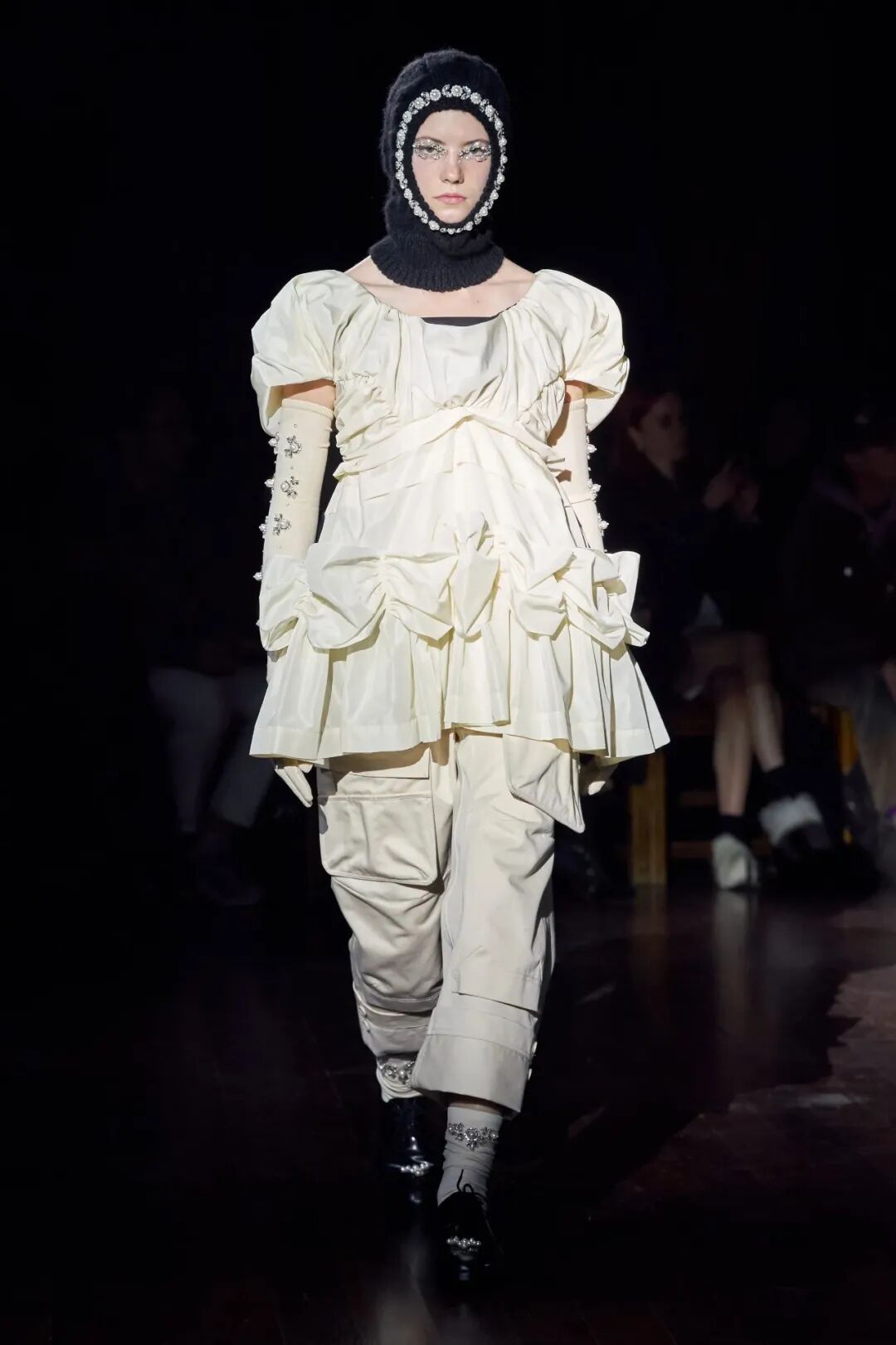 当然,还有面纱。Simone Rocha以前就使用过面纱,不过更多的是在暗示婚礼和洗礼——这是她在天主教爱尔兰的成长经历的背景影响。现在,它们以飘逸的、层层叠叠的结构,覆盖在女性和男性的头上和肩上。