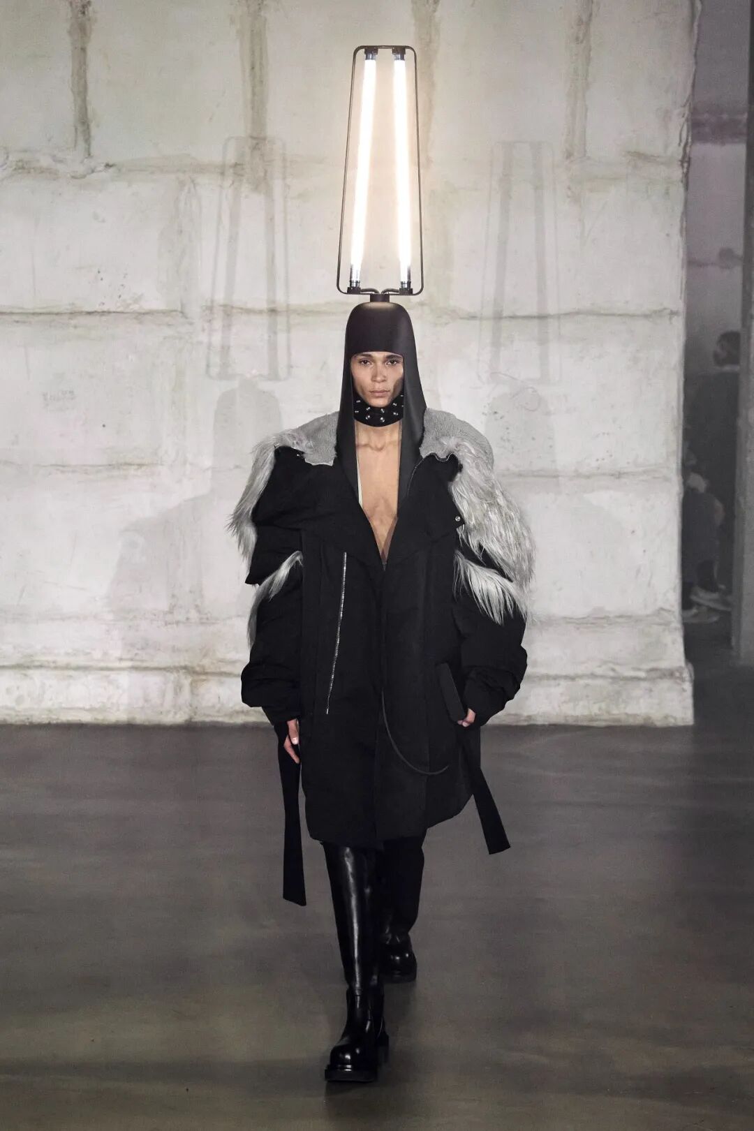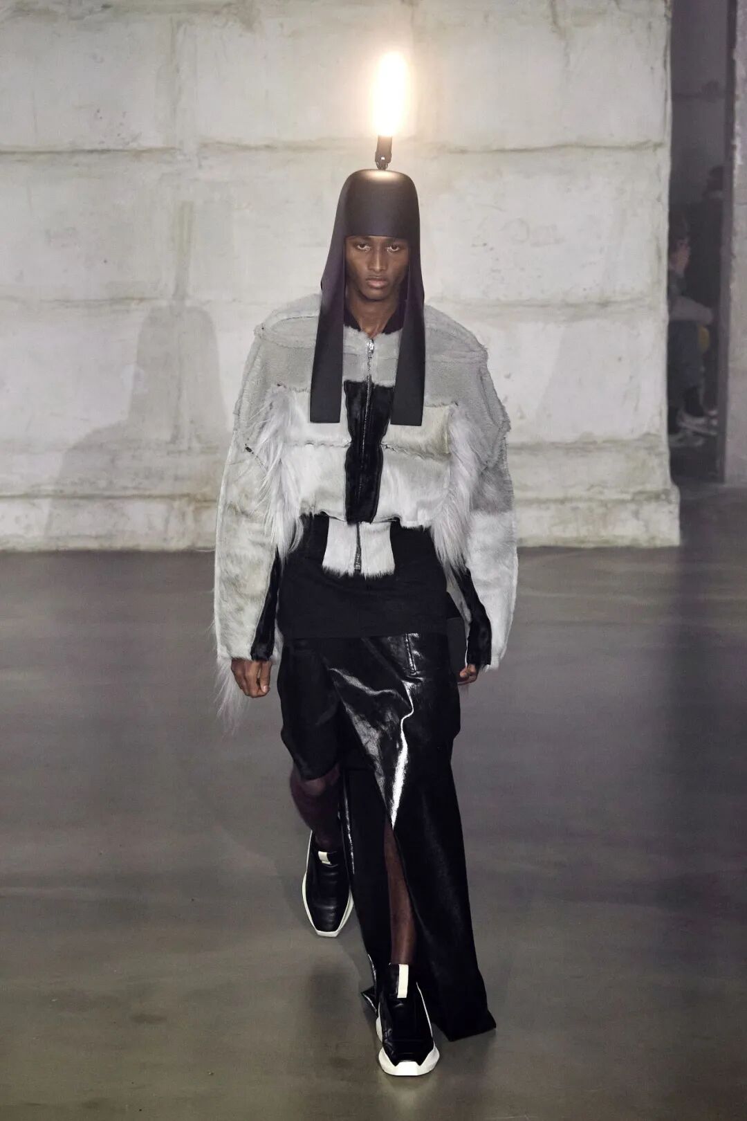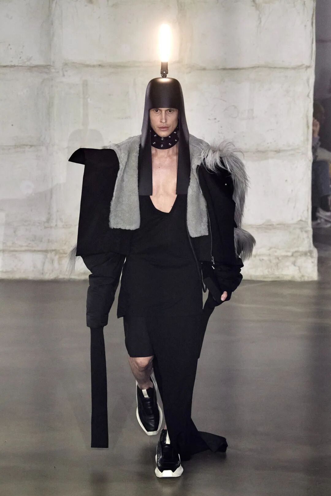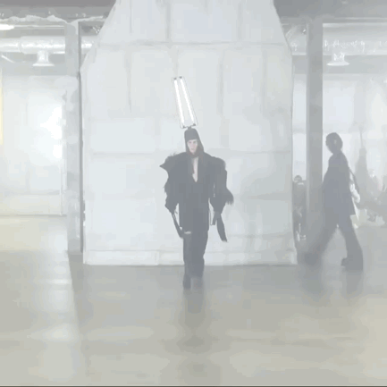 这些闪亮的灯帽可能会吸引大部分的目光,但本次发布仍保持了品牌一贯的廓型设计,从网状夹克到面具般的拉链式兜帽再到廓形羽绒外套,Rick Owens 在本系列中体现的是一种在激素驱动下肆意挥霍的展示。