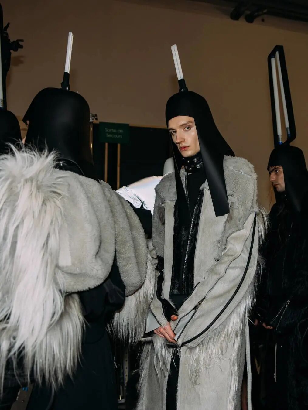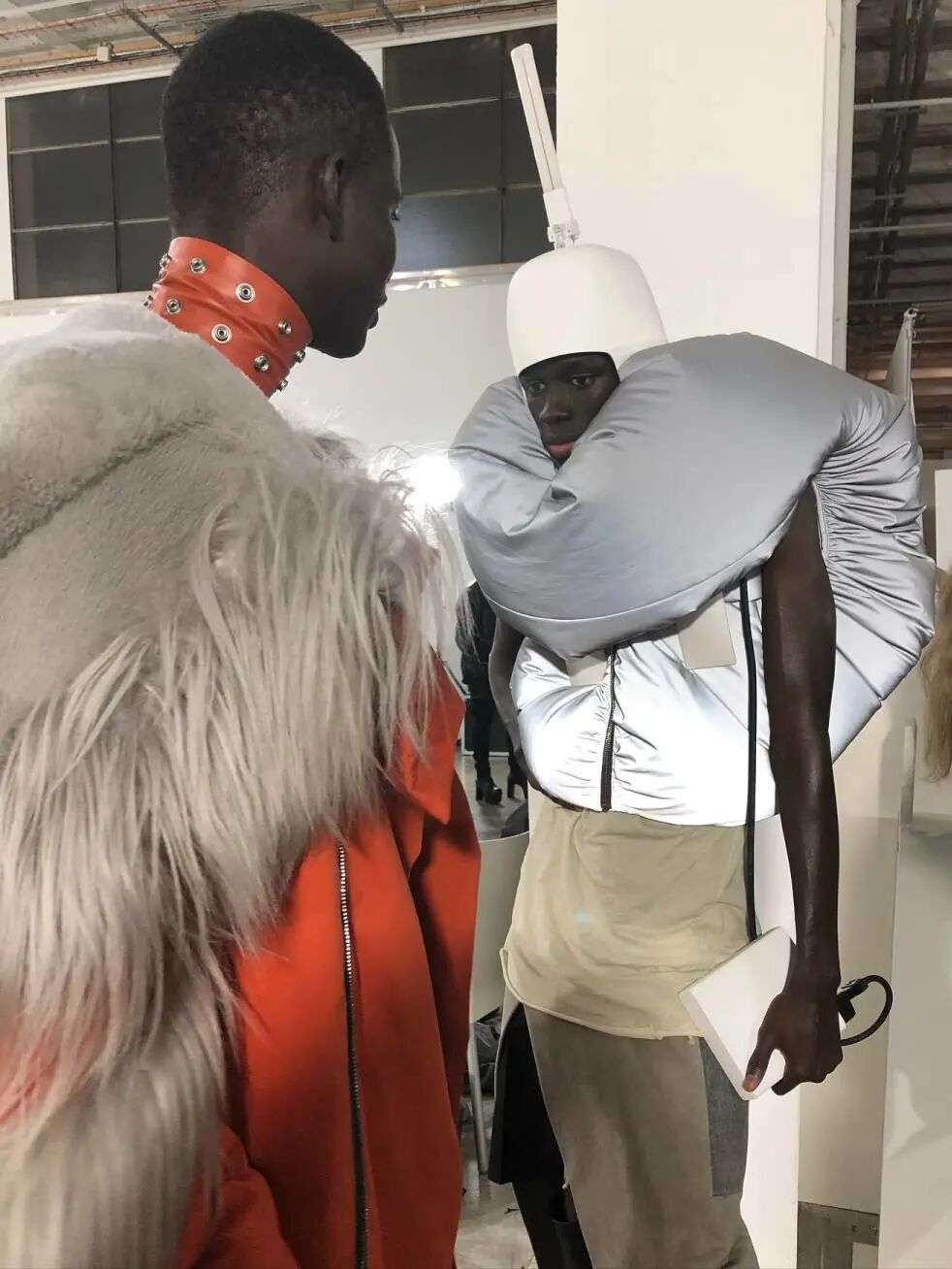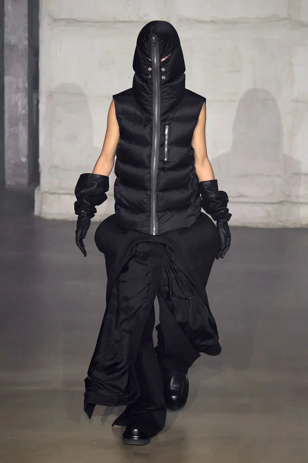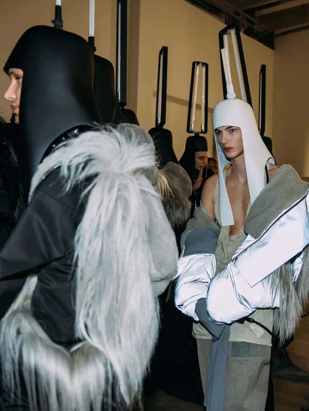 这些闪亮的灯帽可能会吸引大部分的目光,但本次发布仍保持了品牌一贯的廓型设计,从网状夹克到面具般的拉链式兜帽再到廓形羽绒外套,Rick Owens 在本系列中体现的是一种在激素驱动下肆意挥霍的展示。