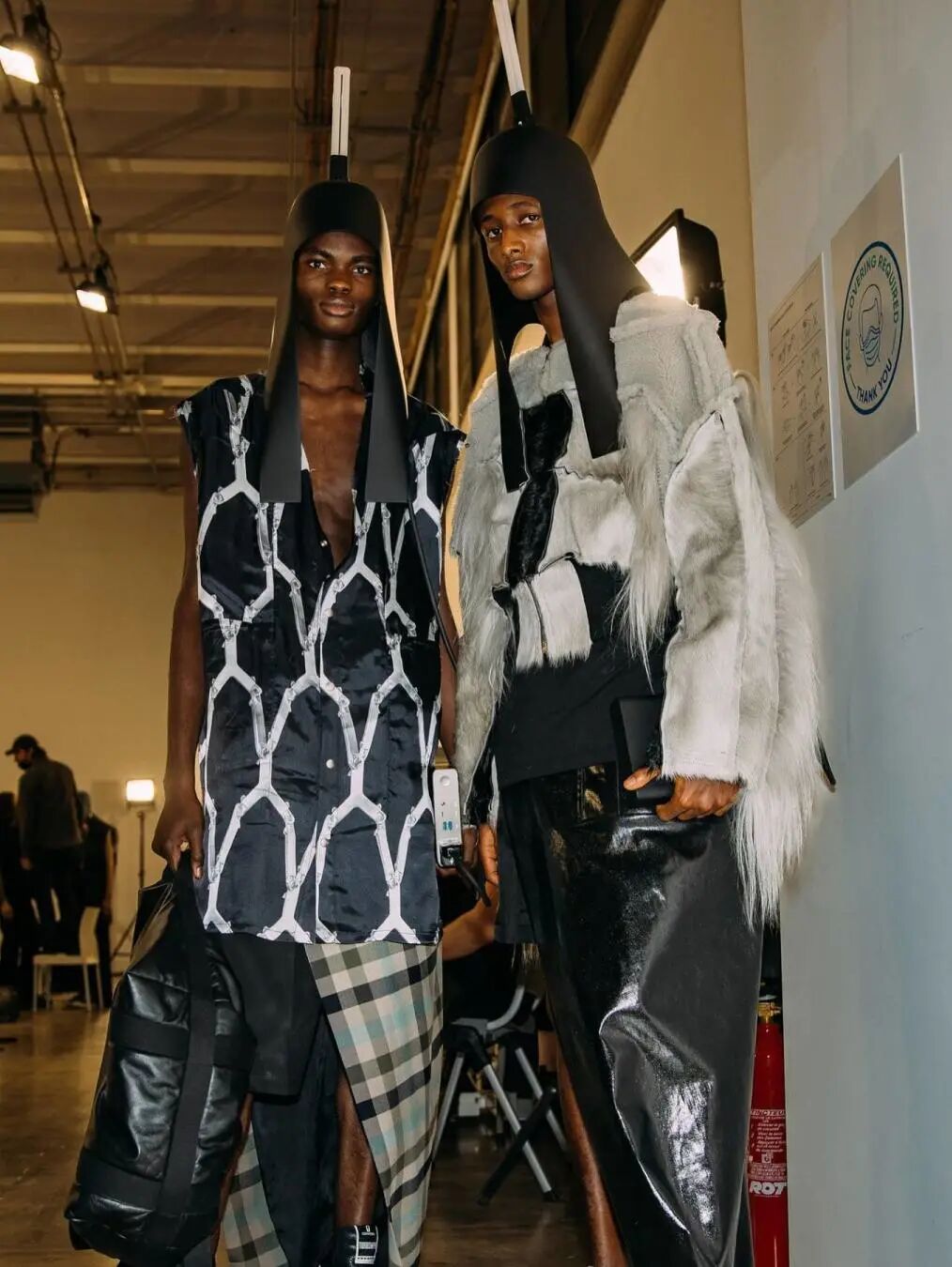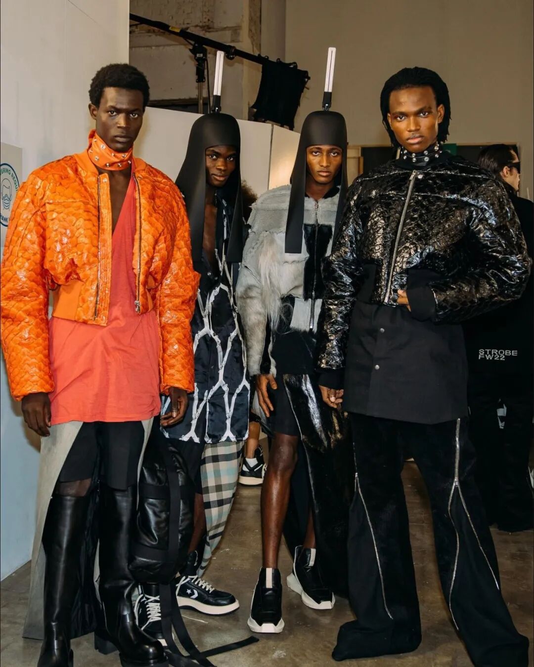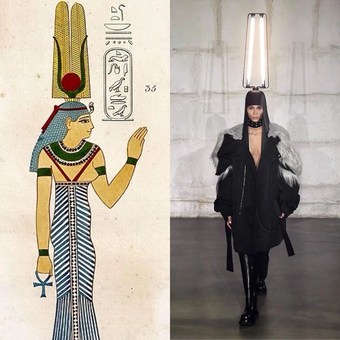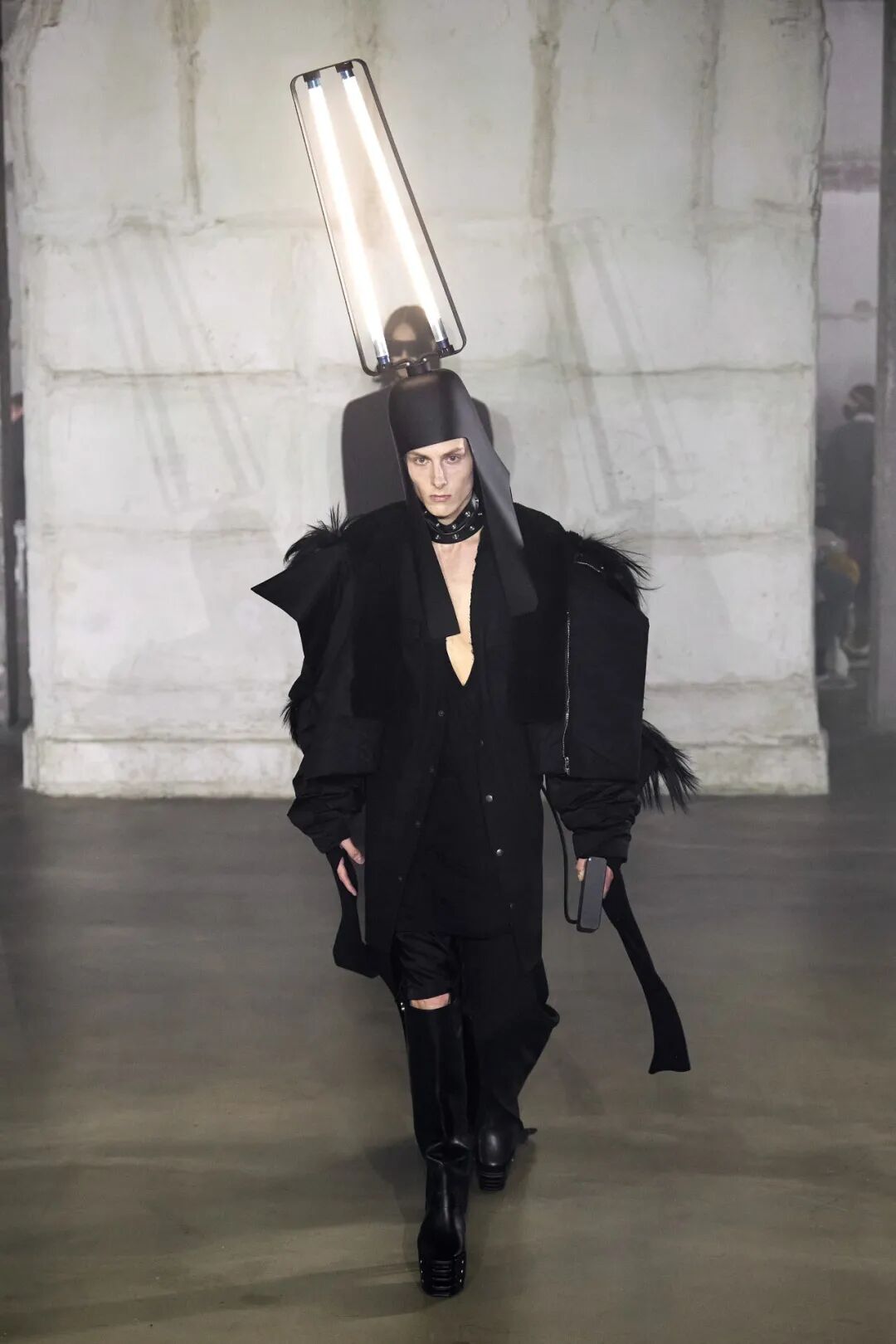 22秋冬男装系列灵感来源于 Rick Owens 的埃及之旅,在途中他被古老奇妙的壁画以及体现的几何形状所深深吸引。通过将古埃及的头饰轮廓与飞利浦灯泡相结合,Rick Owens 创造了同时作为灯使用的头饰,致敬灯光艺术家 Dan Flavin,他也将本次发布的系列命名为 Strobe(频闪)。