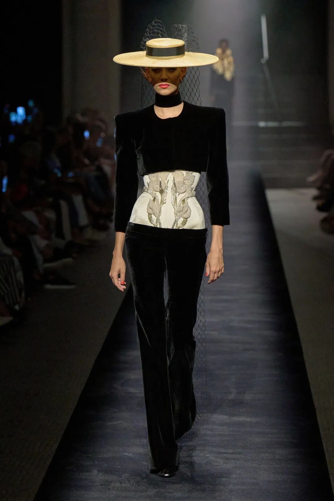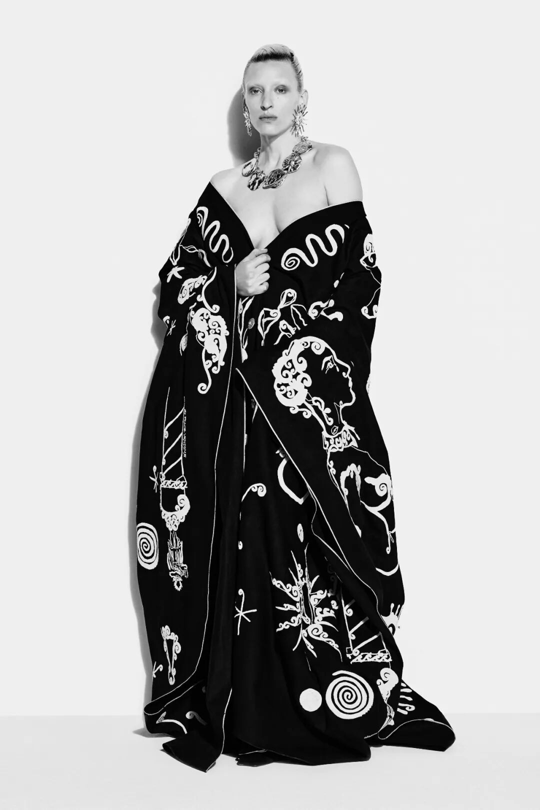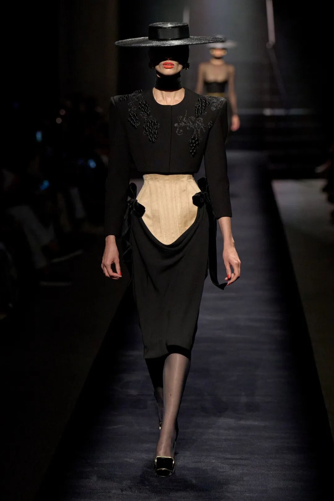 回顾展中还展示了Yves Saint Laurent、Azzedine Alaïa、John Galliano、Christian Lacroix等大师为Schiaparelli设计的作品。在本季的Schiaparelli高定系列中,Daniel Roseberry采用了“与深受Elsa Schiaparelli启发的人们交谈”的理念。今年早些时候,Roseberry还与Christian Lacroix本人进行了面对面的交谈,系列中丰富膨大的廓形裙摆、羊腿袖、闪亮的斗牛士刺绣和帽子,也致敬了这位大师,以及美好怀旧的80年代。