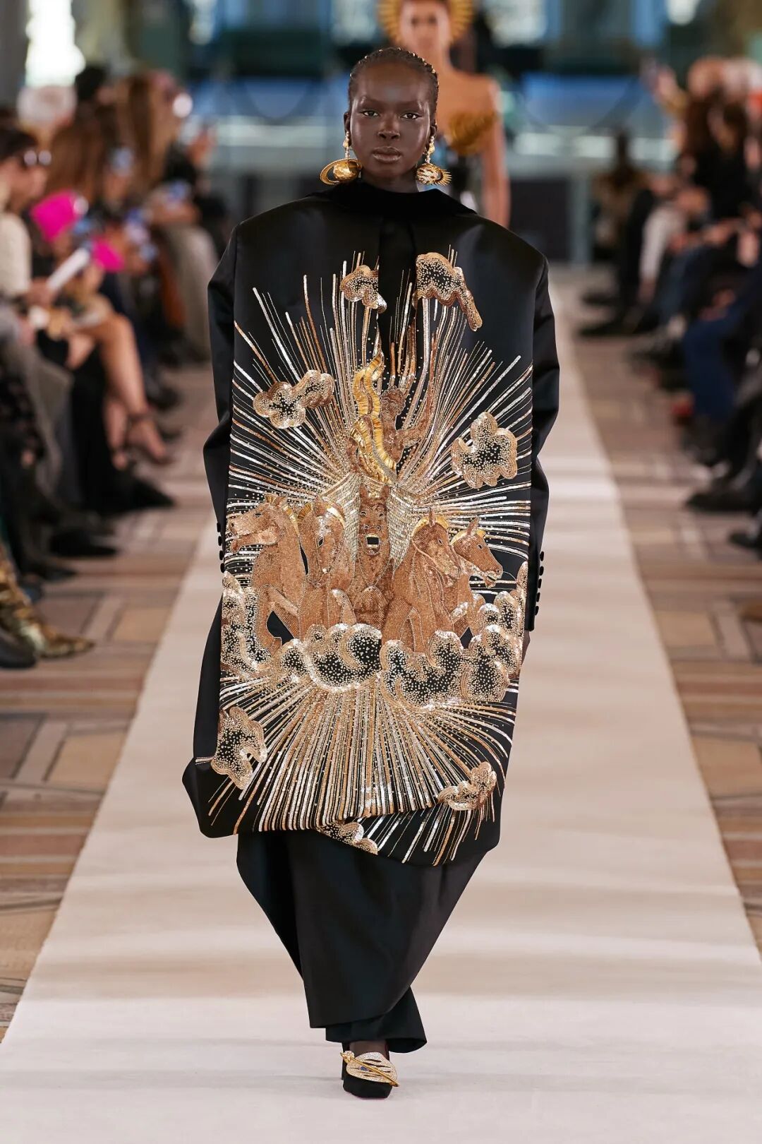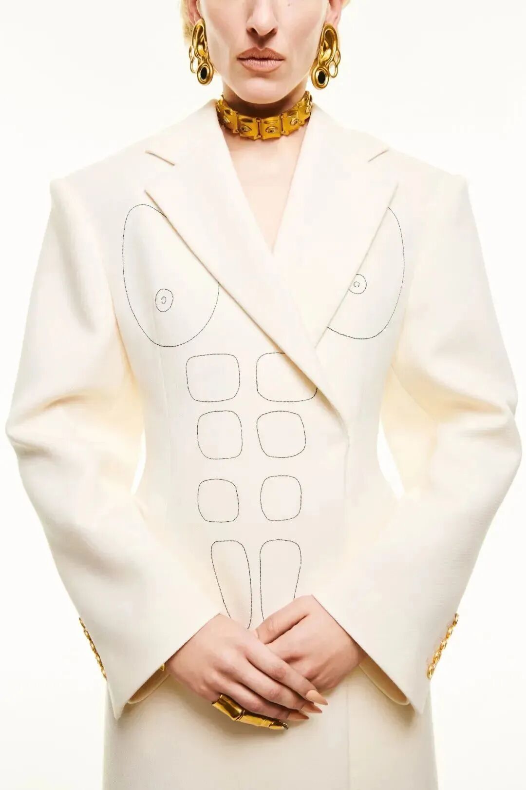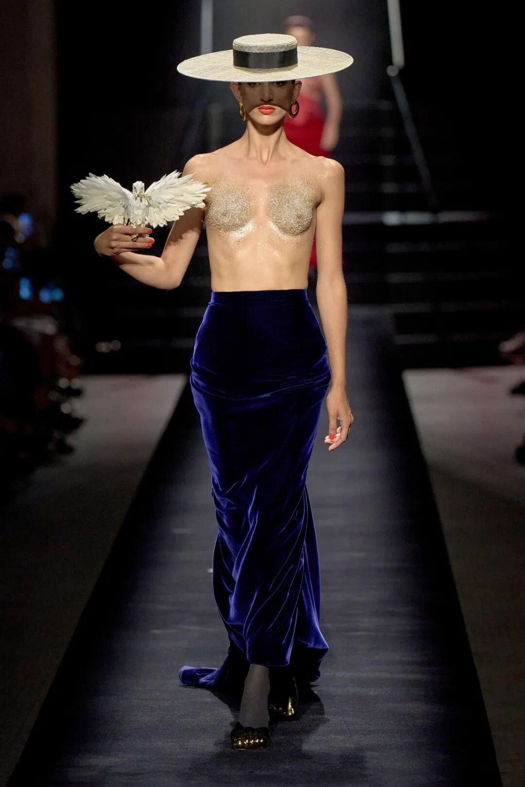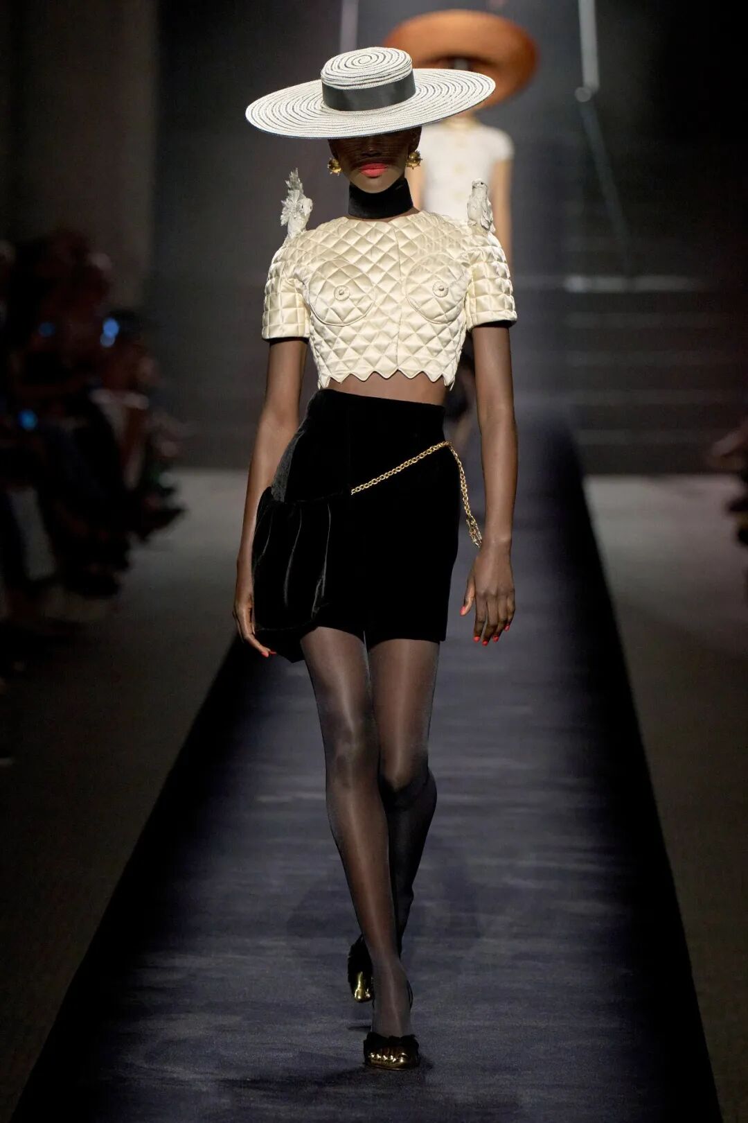 在执掌Schiaparelli后,创意总监Daniel Roseberry不仅延续了金光四射的奢华装饰路线,还将人体的肌肉线条结构以及女性特征融入了各个系列,希望借此表现女性坚毅刚强的一面,这种对于女性主义的探讨成为品牌不可分割的DNA。无论是将女性胸部形状与充满男性特征的壮硕腹肌结合的胸衣,还是宛如圣母哺乳的造型设计,都令人十分惊叹,带给人十分强烈的视觉冲击。