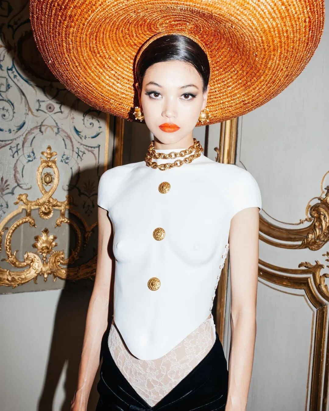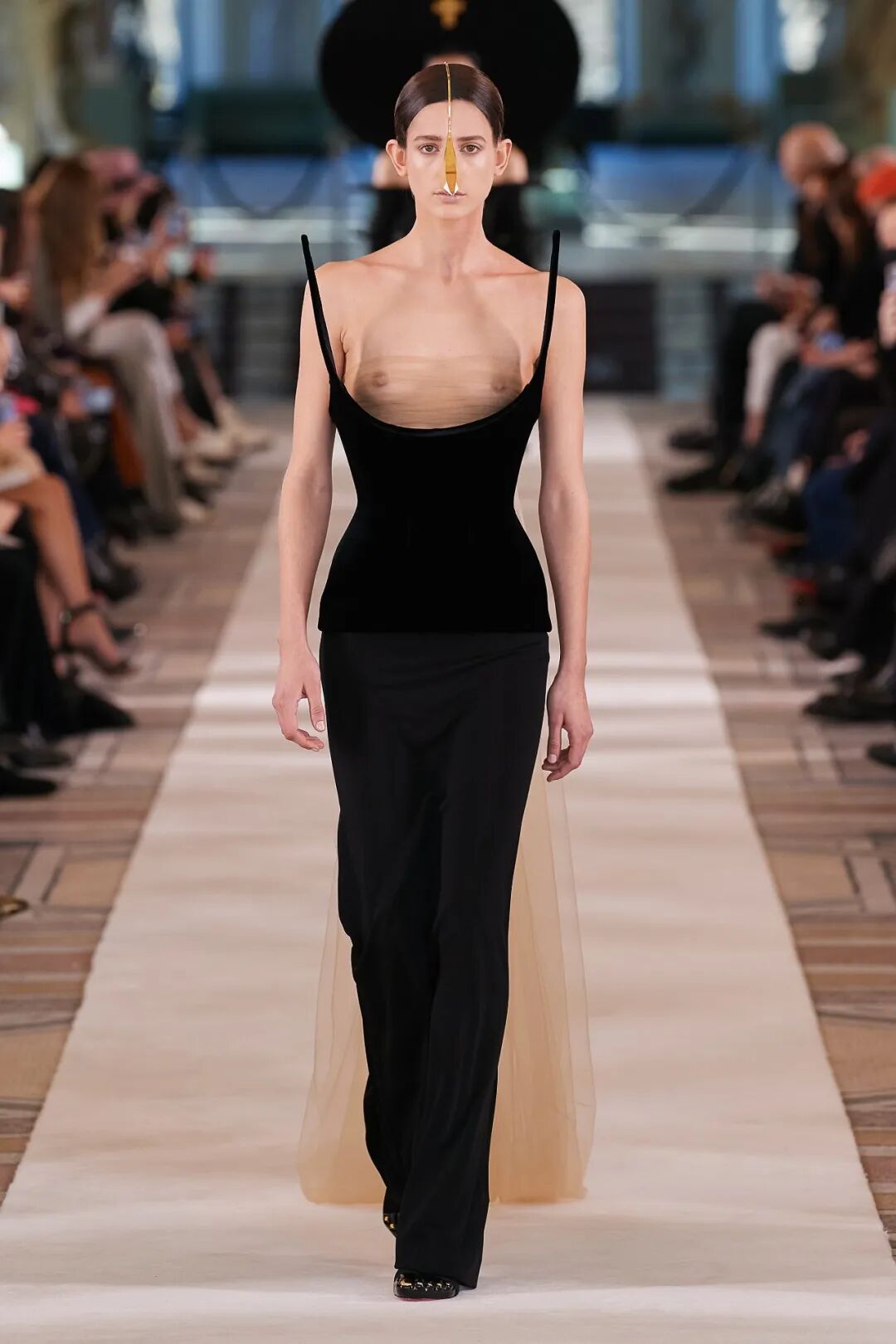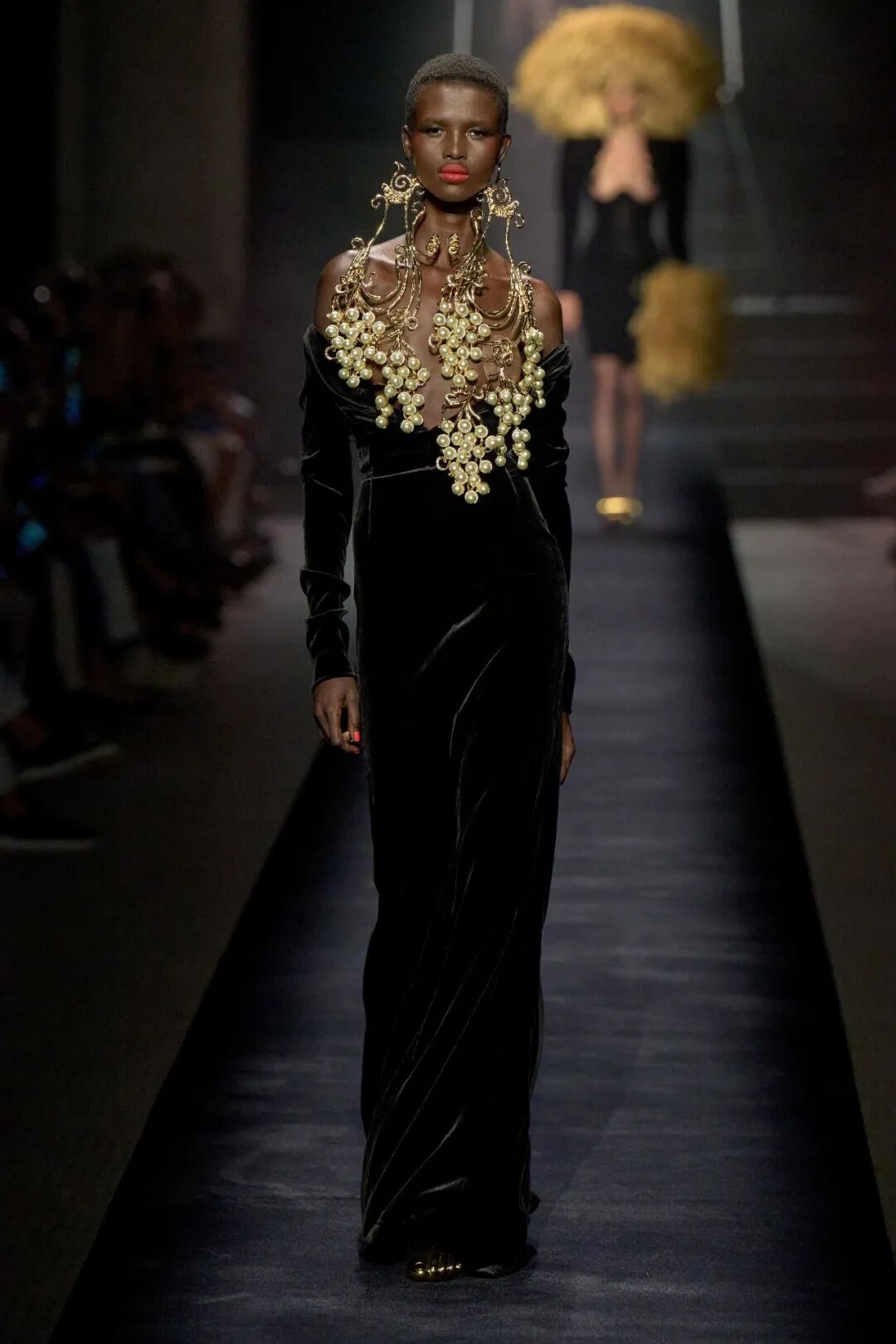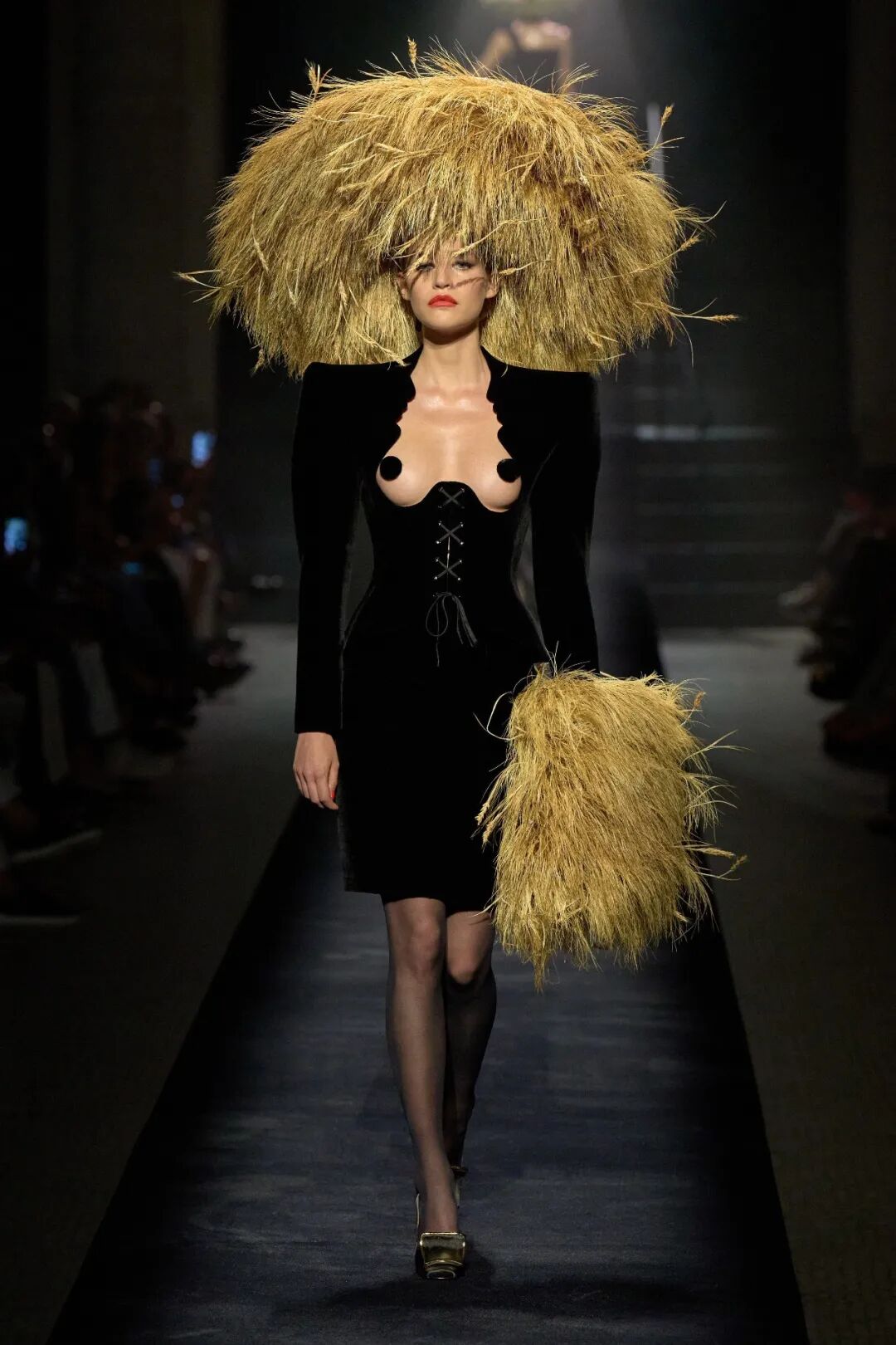 在执掌Schiaparelli后,创意总监Daniel Roseberry不仅延续了金光四射的奢华装饰路线,还将人体的肌肉线条结构以及女性特征融入了各个系列,希望借此表现女性坚毅刚强的一面,这种对于女性主义的探讨成为品牌不可分割的DNA。无论是将女性胸部形状与充满男性特征的壮硕腹肌结合的胸衣,还是宛如圣母哺乳的造型设计,都令人十分惊叹,带给人十分强烈的视觉冲击。