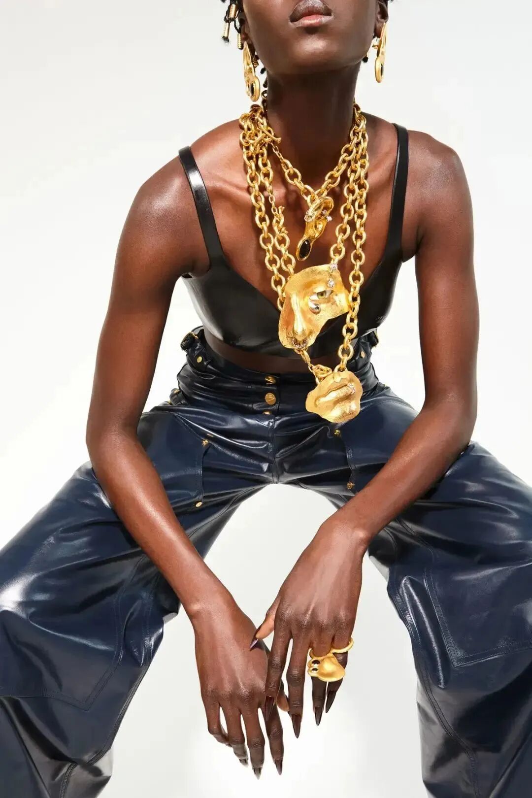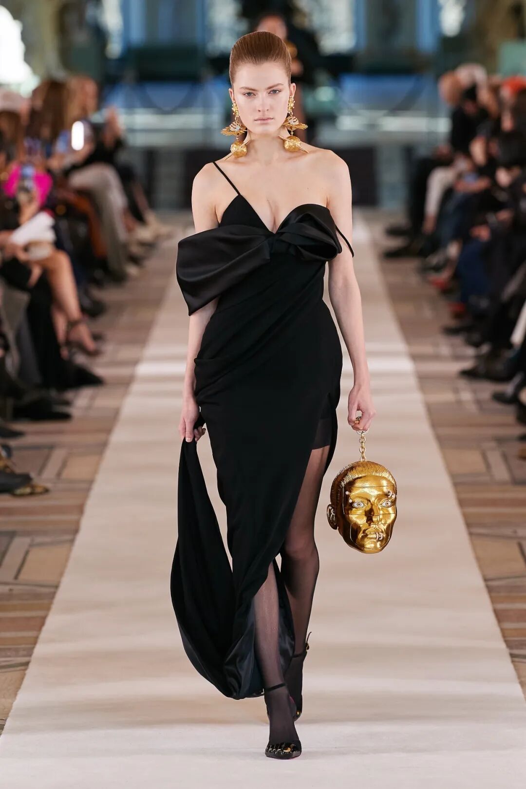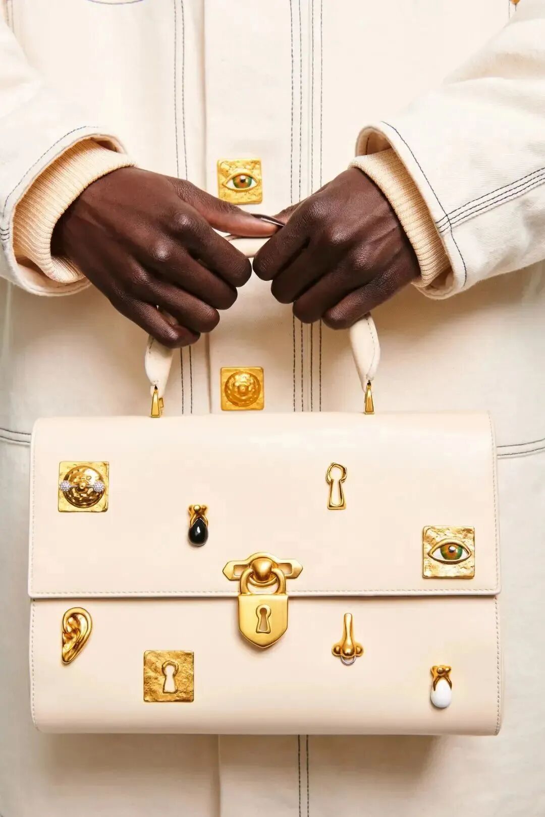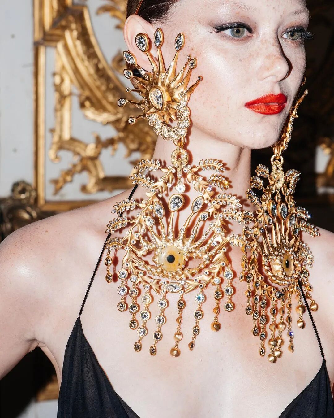 除开服装,Daniel Roseberry在许多配饰上对于人体器官的具象应用,尤其是女性身体之上,都能充分体现出他的超现实主义设计理念,一切都充满着怪诞而神秘的色彩。