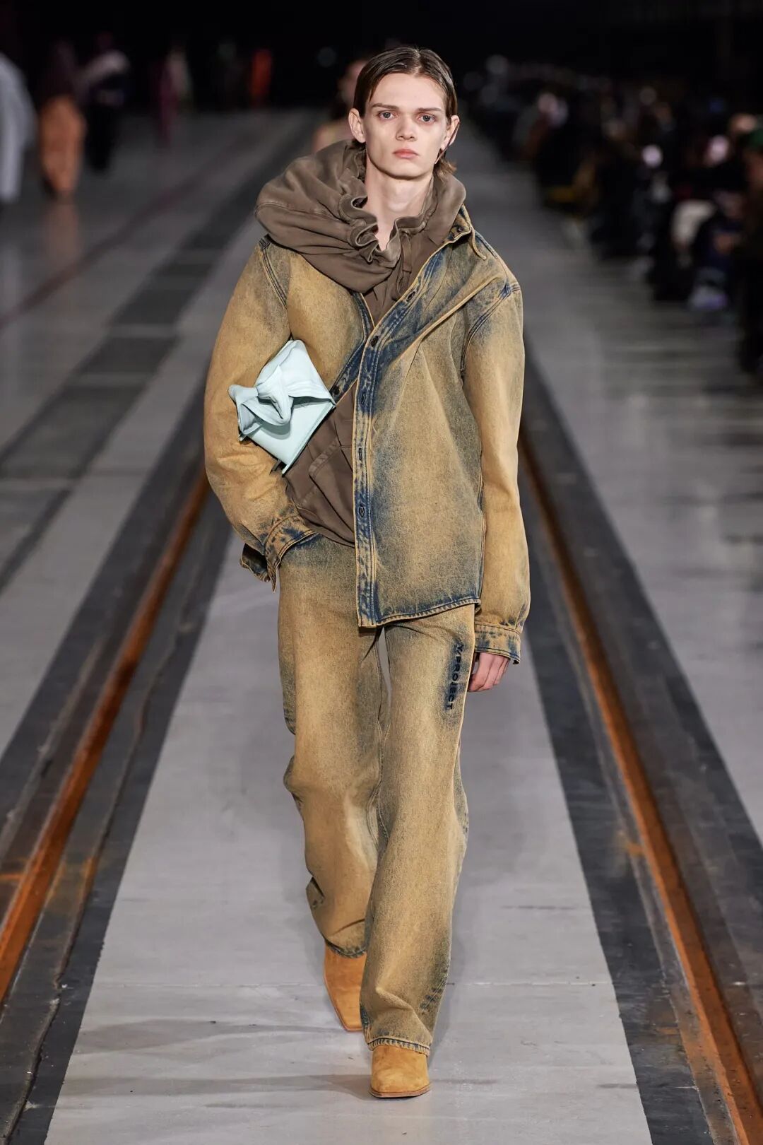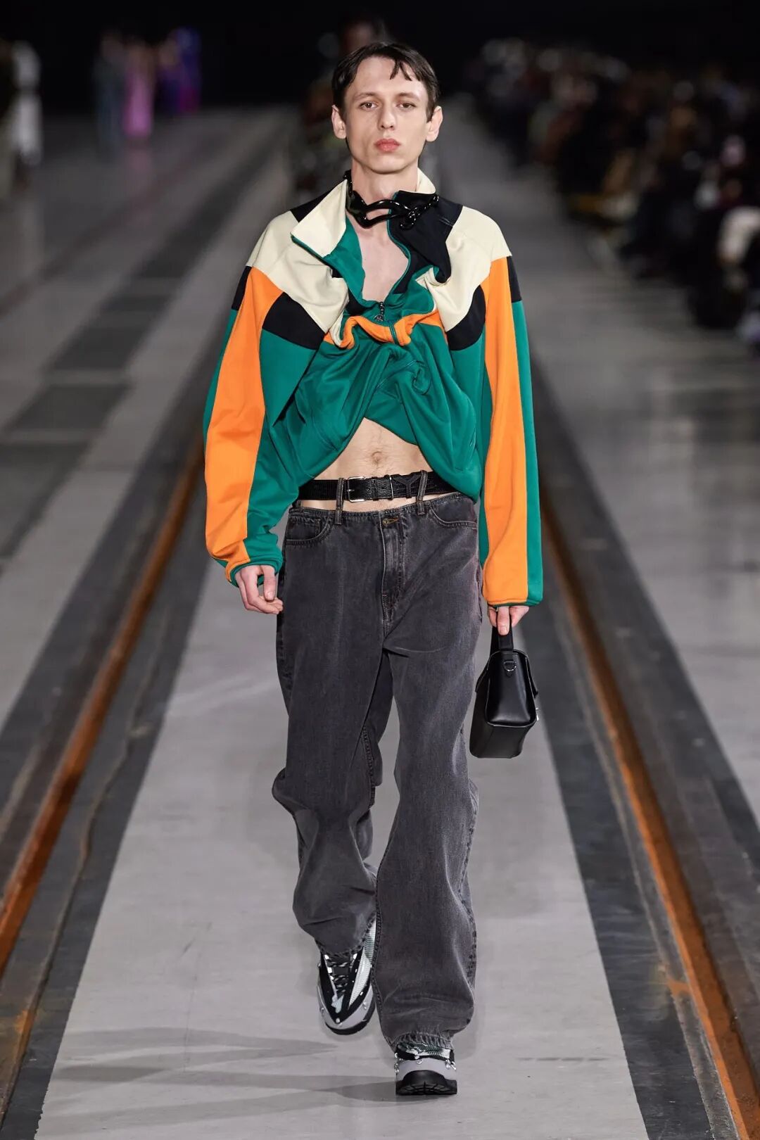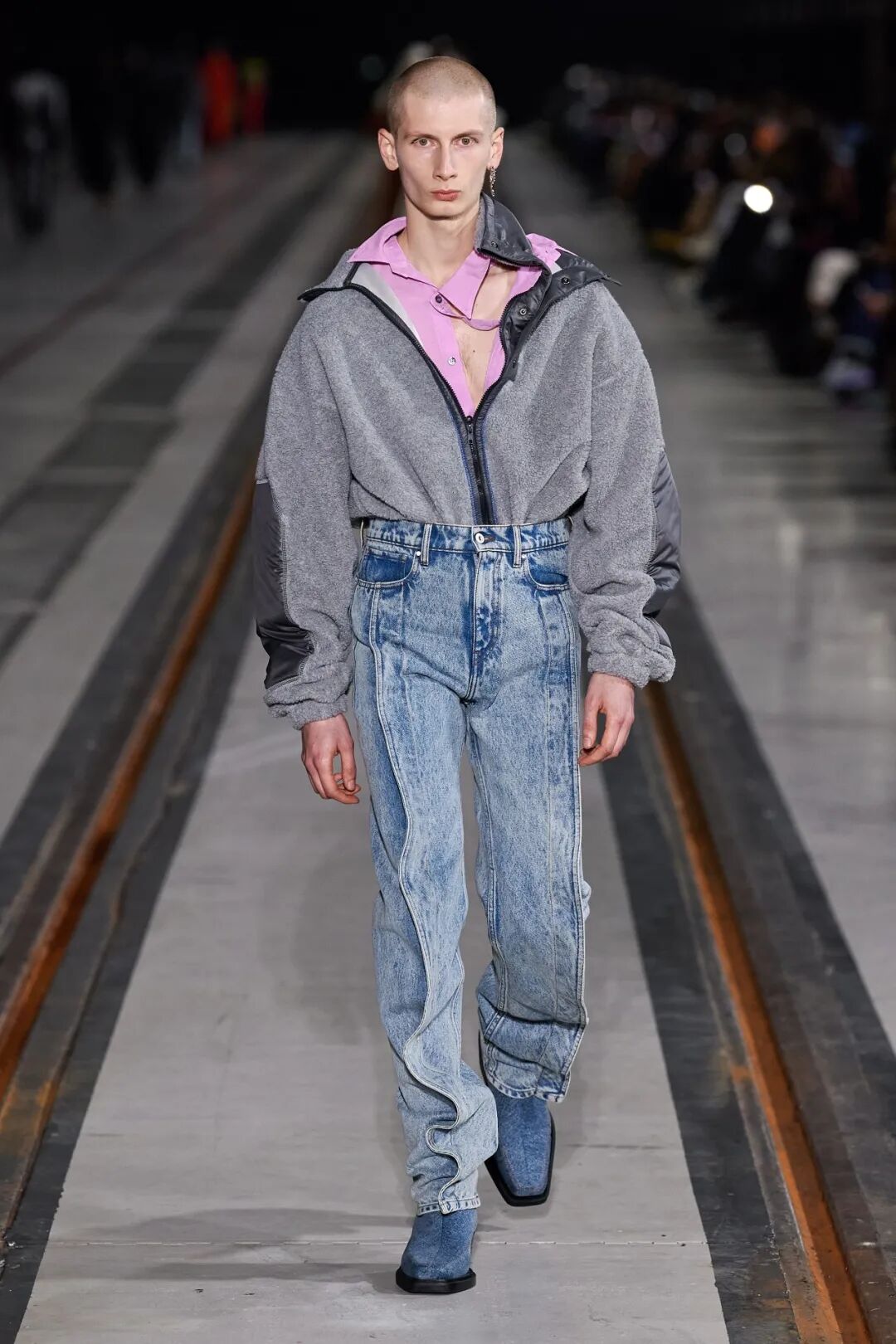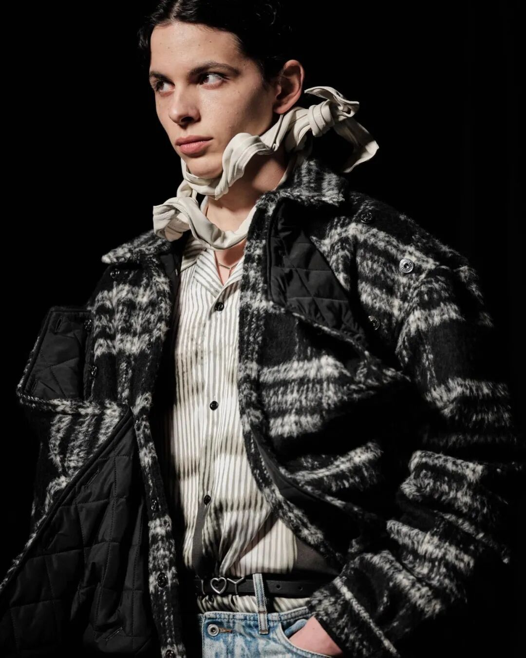 Glenn Martens 作为拿手好戏的解构主义、错位剪裁、万物皆可褶皱已在往季的 Y/Project 中尽数体现。在本季的秀场造型中,也对过去十年的那些招牌设计进行了回顾,无论是牛仔衣、运动服、皮衣还是羊毛大衣,随处可见的解构与褶皱,立体感强烈,风格也依旧夸张前卫。