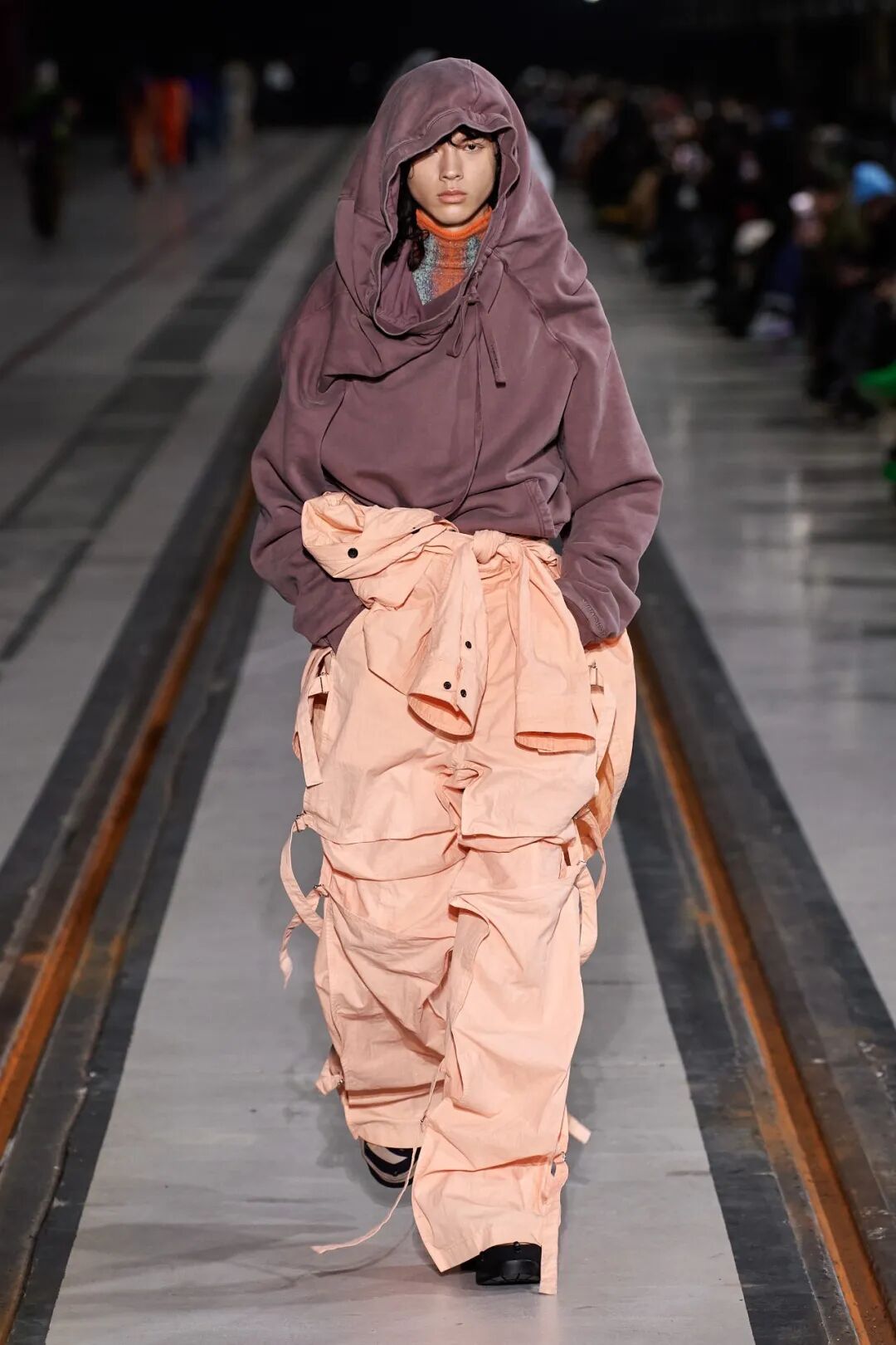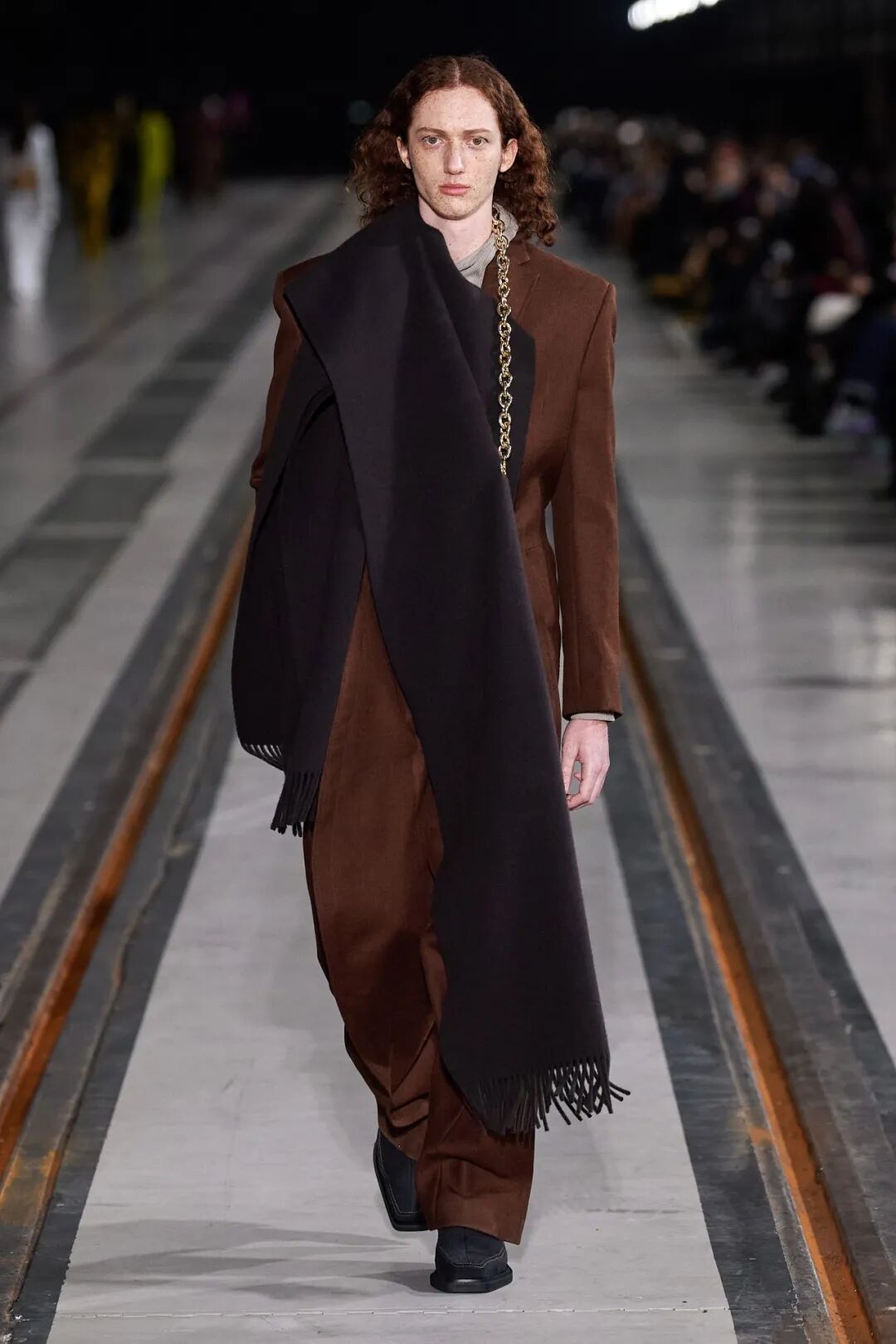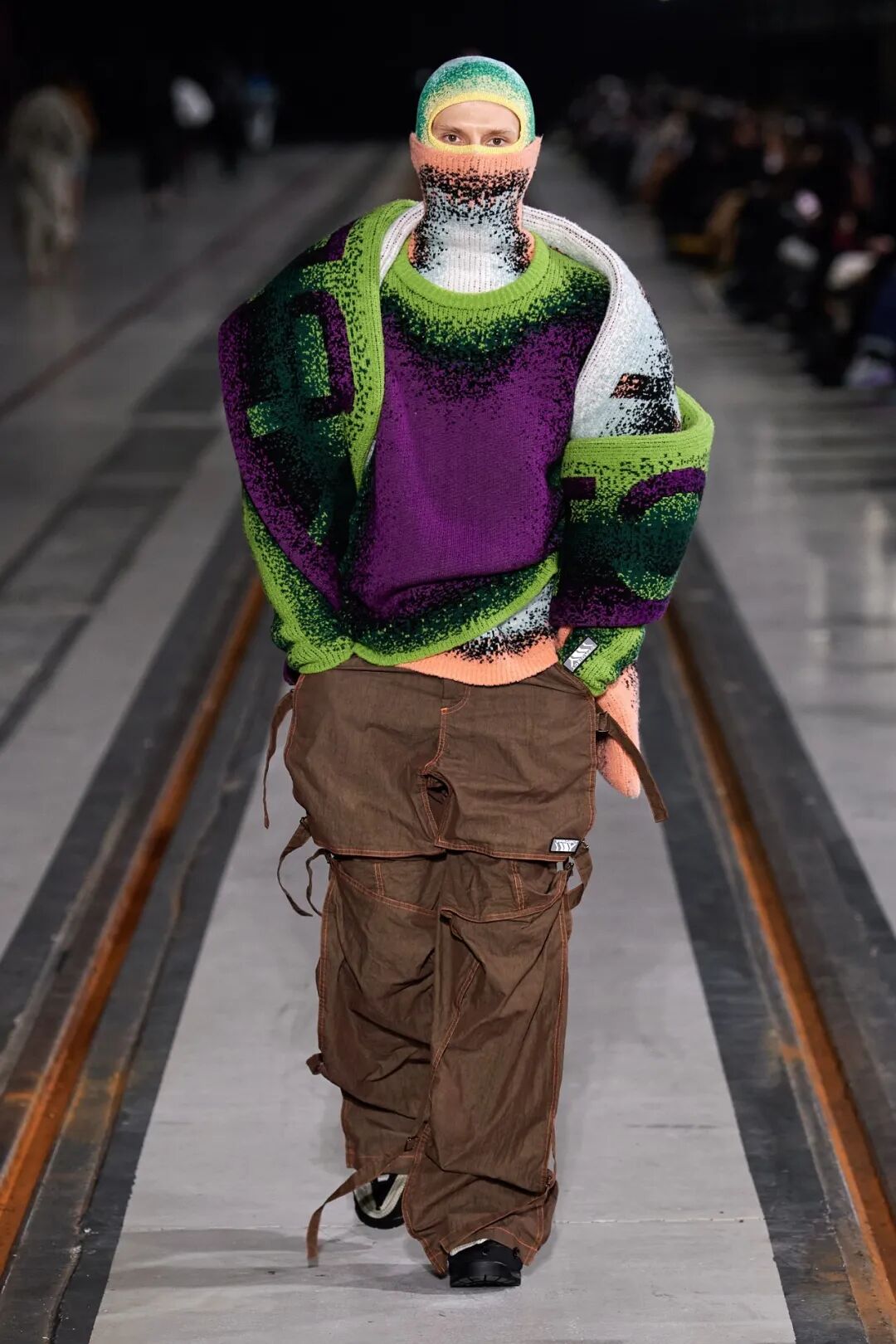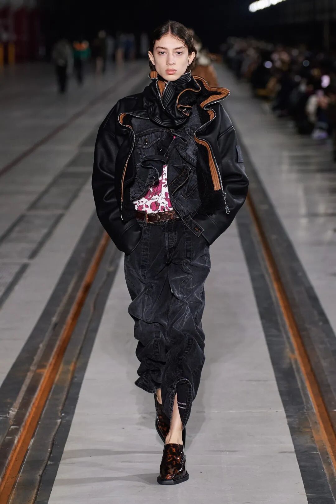 Glenn Martens 作为拿手好戏的解构主义、错位剪裁、万物皆可褶皱已在往季的 Y/Project 中尽数体现。在本季的秀场造型中,也对过去十年的那些招牌设计进行了回顾,无论是牛仔衣、运动服、皮衣还是羊毛大衣,随处可见的解构与褶皱,立体感强烈,风格也依旧夸张前卫。