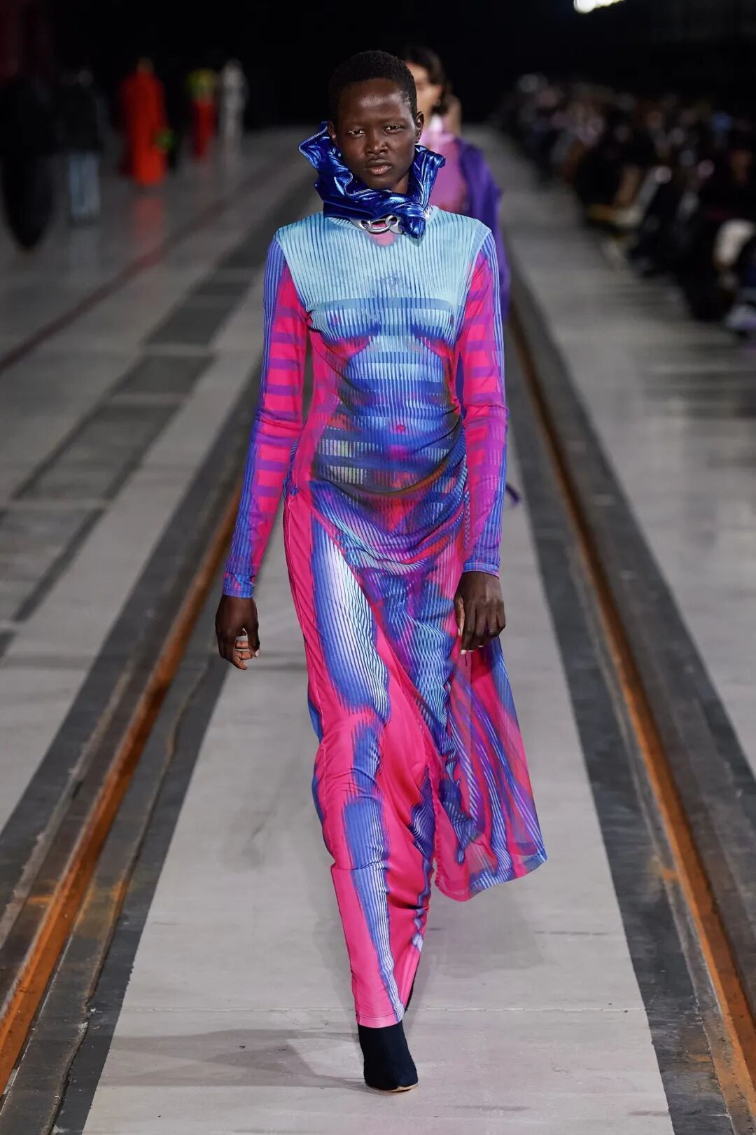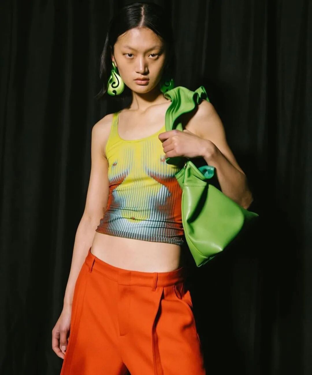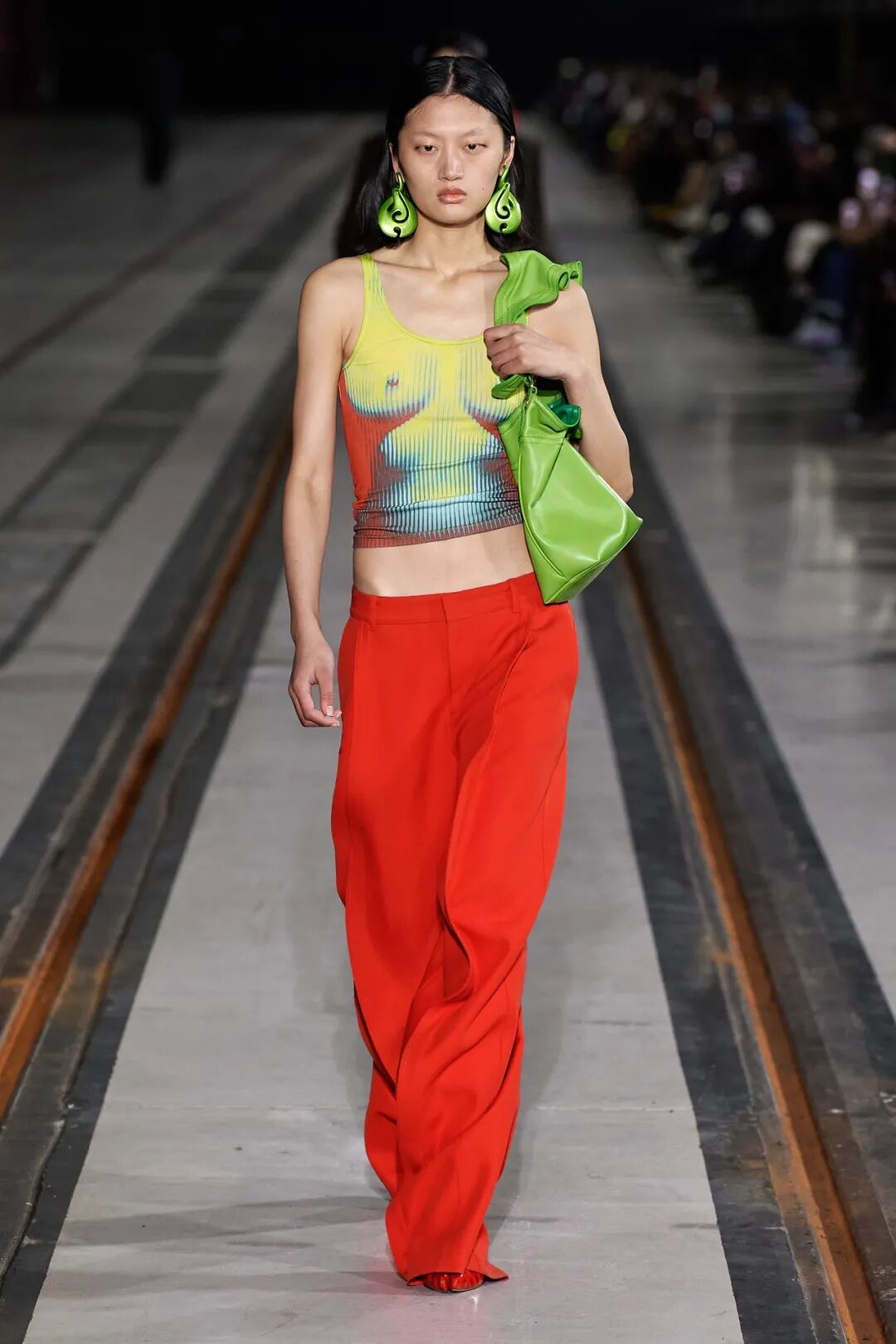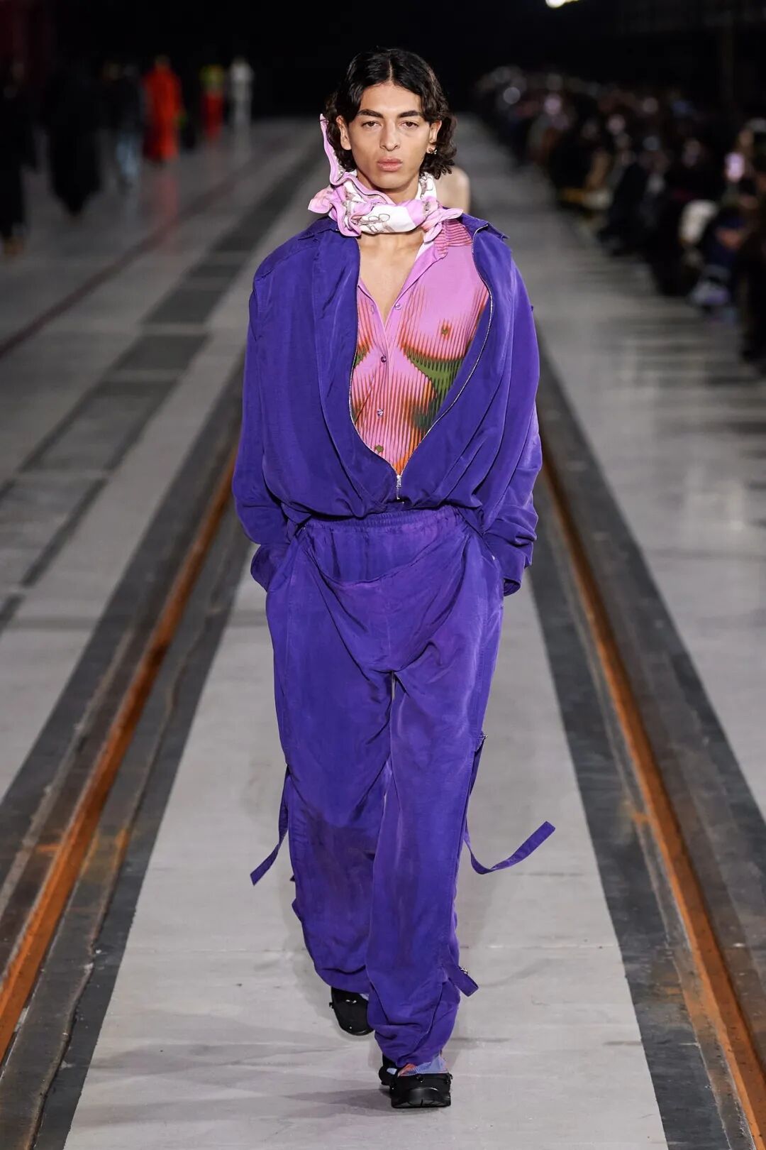 在 Y/Project 一直强调的无性别主义中,Glenn Martens 在本季也抛弃了该主义常用的黑白灰色彩,转向更加热烈的色彩与印花的大胆表达。