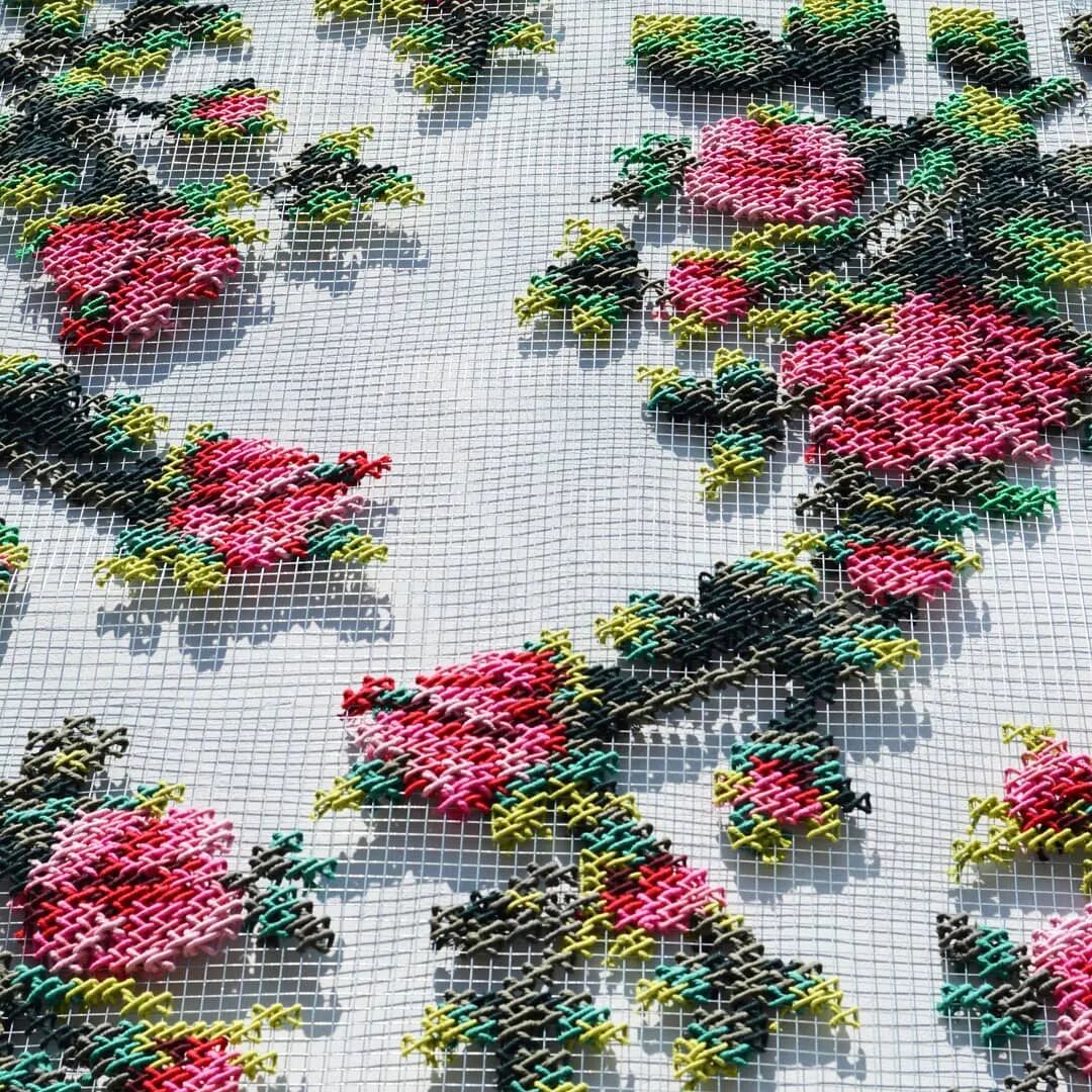 与其说拉奎尔·罗德里戈的作品是刺绣,倒不如说是一种用特殊材料“画”成的街头艺术,因为,她的刺绣作品不是绣在织物上的,而是在一整面墙上。玄机就在于此,从远处看,好像是花朵在墙上开放,近看才知道,艺术家是将花朵刺绣在了金属丝网格上。这位艺术家将建筑和针线活儿进行了巧妙的结合,为街头艺术提供了全新的视角。