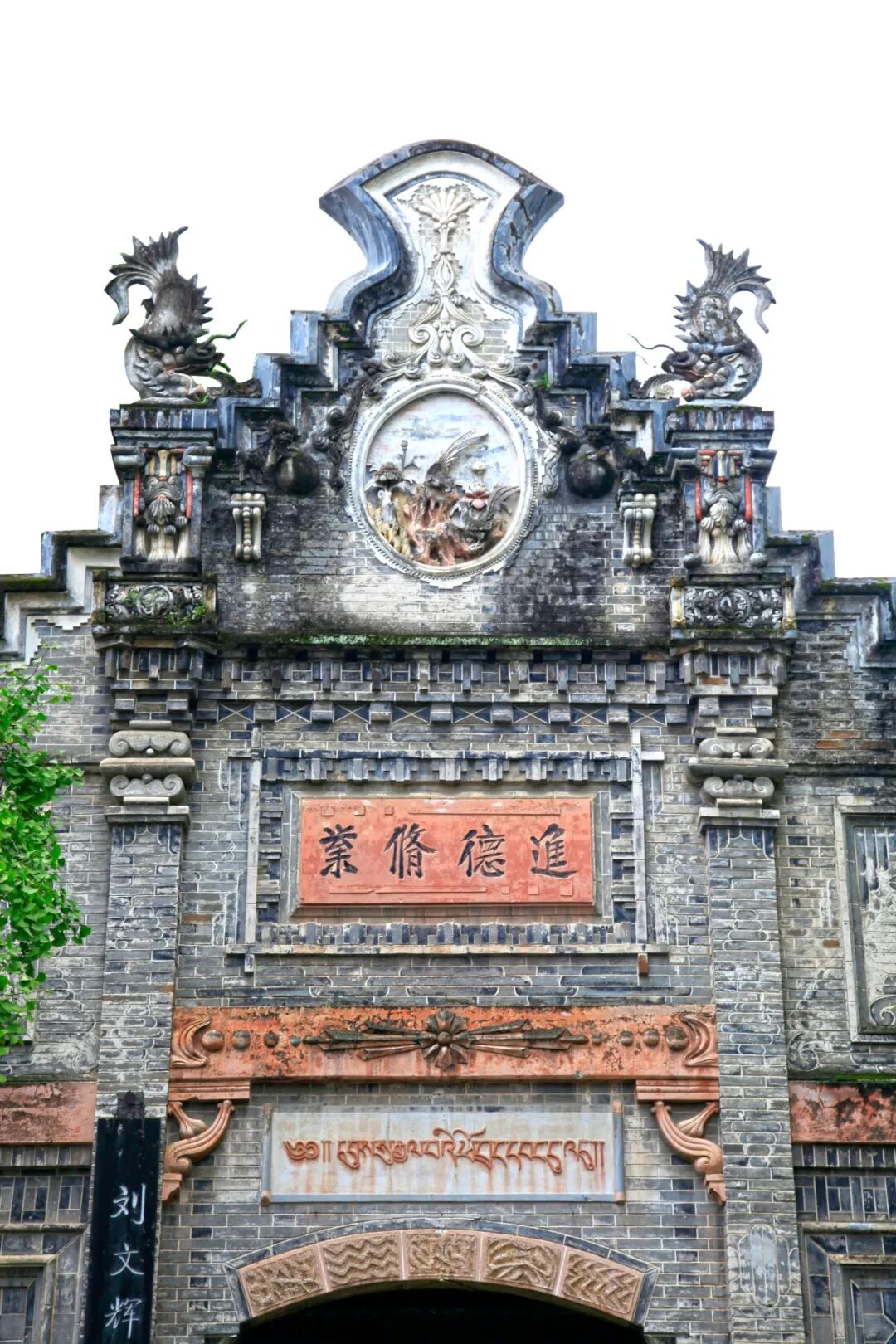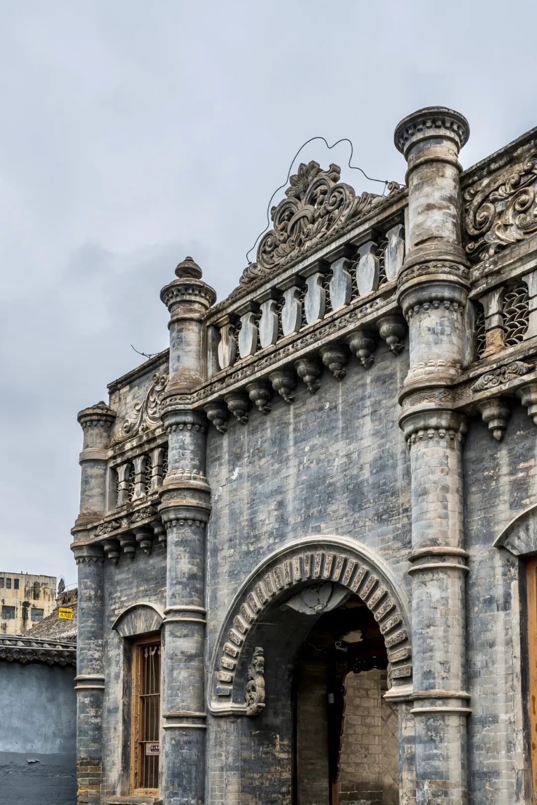 东公馆始建于1938年,落成于1945年。省内外的能工巧匠耗时八年,造就了这一河州砖雕艺术的宝库。东公馆的大门庄重威严,西洋风格浓郁。大门大面积使用了砖雕装饰,巨大的拱门上方还镶嵌着一圈彩色的砖面,配合两旁简洁的柱饰,营造出素雅的氛围。