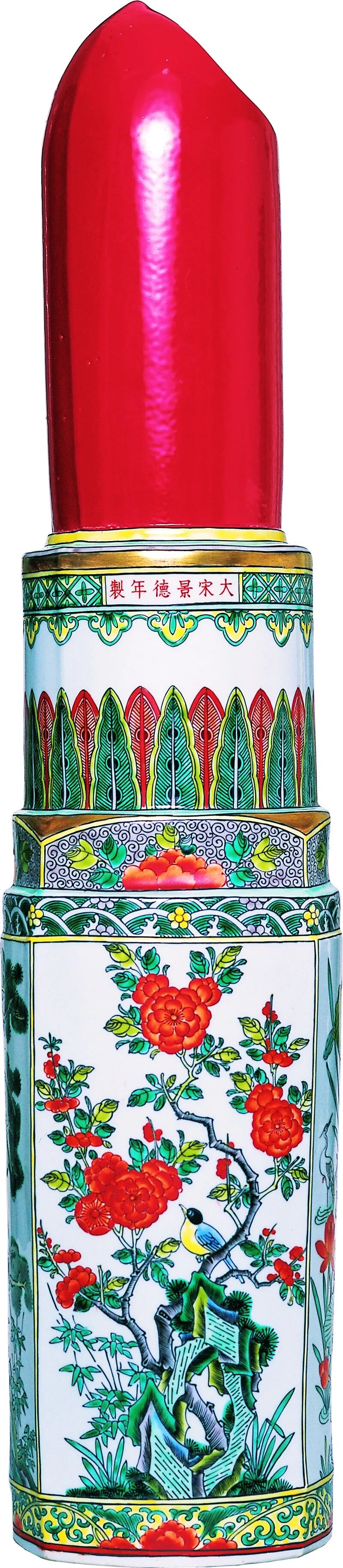 同时也示意着传统僵化的、强制性的手工技艺与现代消费中诱惑性、弹性化的现代生产力相冲突,在这样一个西方文化渗透越来越汹涌的时代,在消费和权利弥漫的时代,作为70后代表性艺术家,马军依然秉持着通过以民族文化为积淀,在形态和图式上试图放大夸张现代消费欲的膨胀感。硕大而艳丽的口红,在官窑式装饰衬托下凝结了这个时代中消费时尚的审美与荒谬感。粉彩重工刻画的一部部豪车,使得观者驻步凝视的同时,被截取下充斥着消费欲望的脑电波。传统工艺与现代工业文明在消费时代的冲突撞击中,在后现代主义的创新构建和自我批判消解中,也呈现出一个民族在文明进程中自我矛盾且尴尬的境地,以及每个个体在此中的自我定位与价值取向的思索和挣扎。