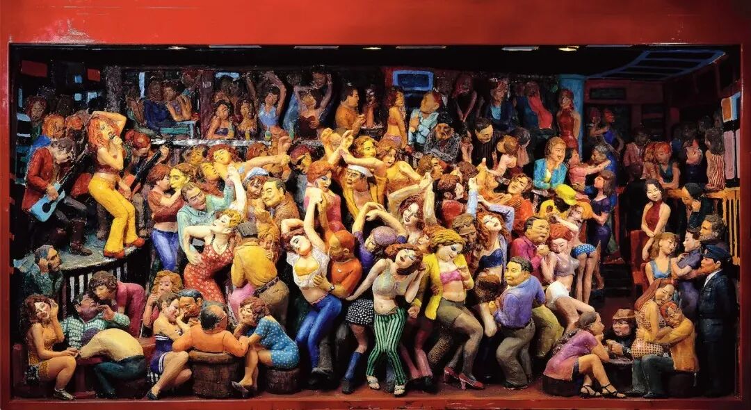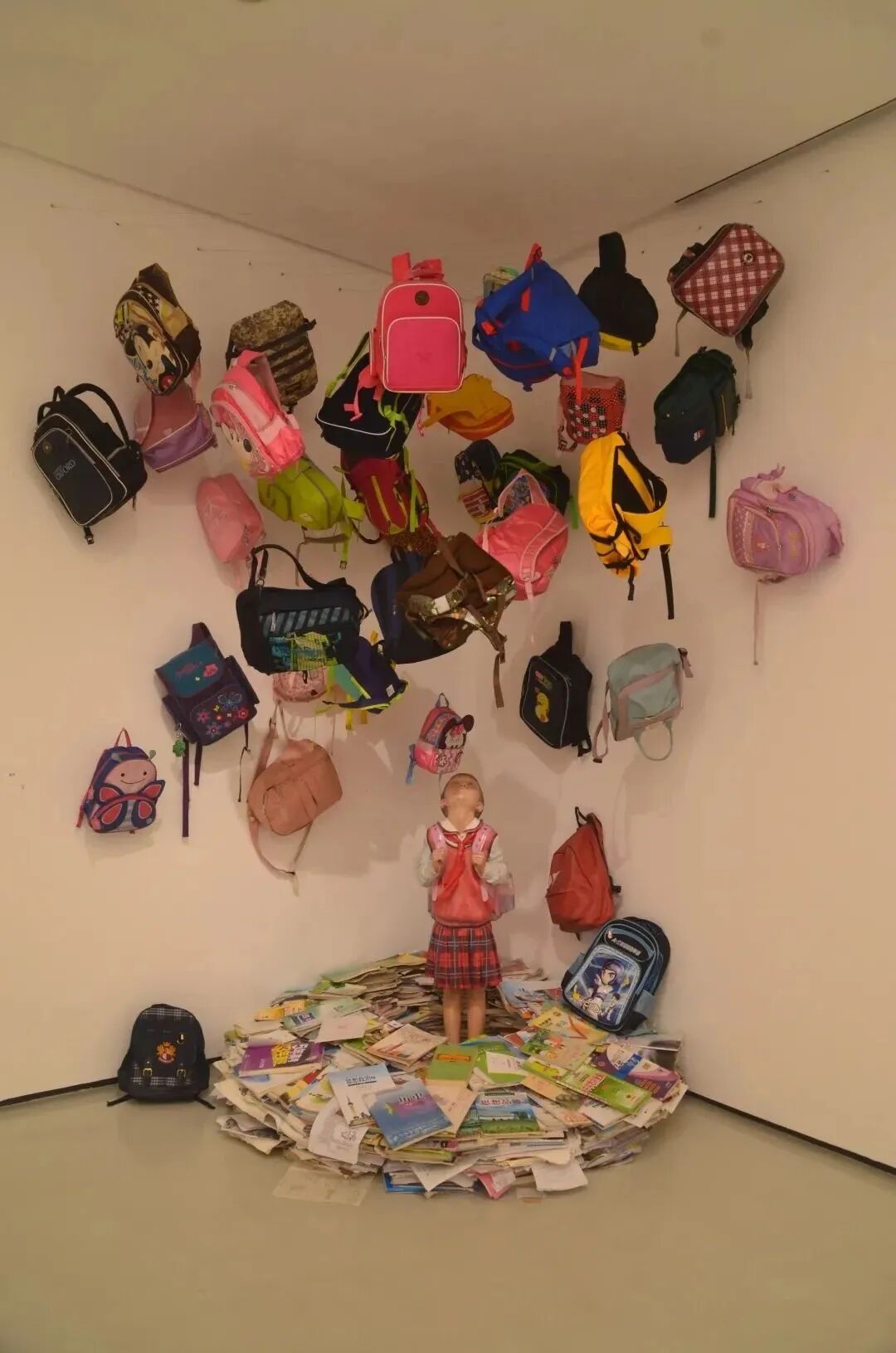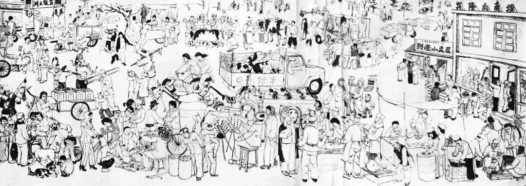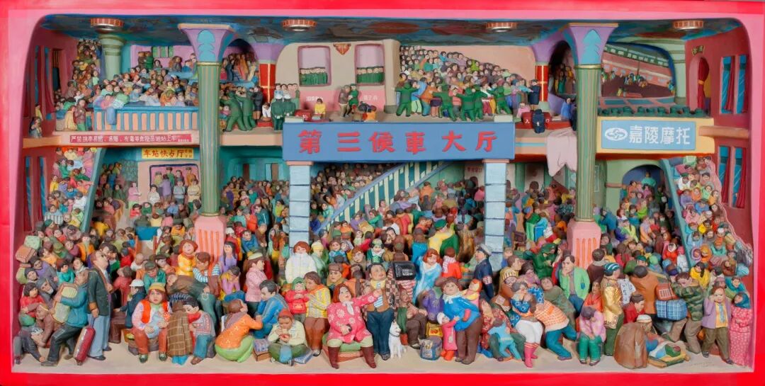 我从小就喜欢画画,好像从小就会画,你看这是我13岁时候画的,原作已经丢了。我小时候在少年宫学画画,我妈那时一定要送我去,因为小孩自己决定不了自己的命运,很多时候是父母的引导。其实我妈是个很不现实的,很浪漫的一个人。我外公家是地主,30多岁的时候到长春做生意。因为在东北的特殊地域历史环境,我们童年时的那个现实背景下,讲阶级斗争,所以我妈非常受气,也觉得自己要把孩子培养出来争口气,其实当时按道理说是没什么条件的。我们那个时候上学得坐火车来回,从小镇上去城里上班的成年人,二十几岁到五十几岁的各色人等,早上去晚上回。我当时上课一般都有好几小时待在火车站等车,火车站是人群聚集的地方,什么人都有,无聊的时候也就四处看,观察各色人等,前面那张画的也就是这么一个情景。