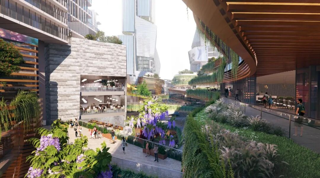 景观设计着重组织各功能空间的过渡、衔接,组织景观序列、游览节奏,激活空间活力,充分发挥项目多业态优势。以生态绿色为基底,选用大量低维护植物,营造生态峡谷的场景感受,强化深铁集团低碳生态的城市发展理念。设计还融入现代设计手法,局部采用声光电等科技应用,在展现深铁集团“生命、科技、智慧”企业理念的同时,打造会呼吸的绿色枢纽和多维立体花园。