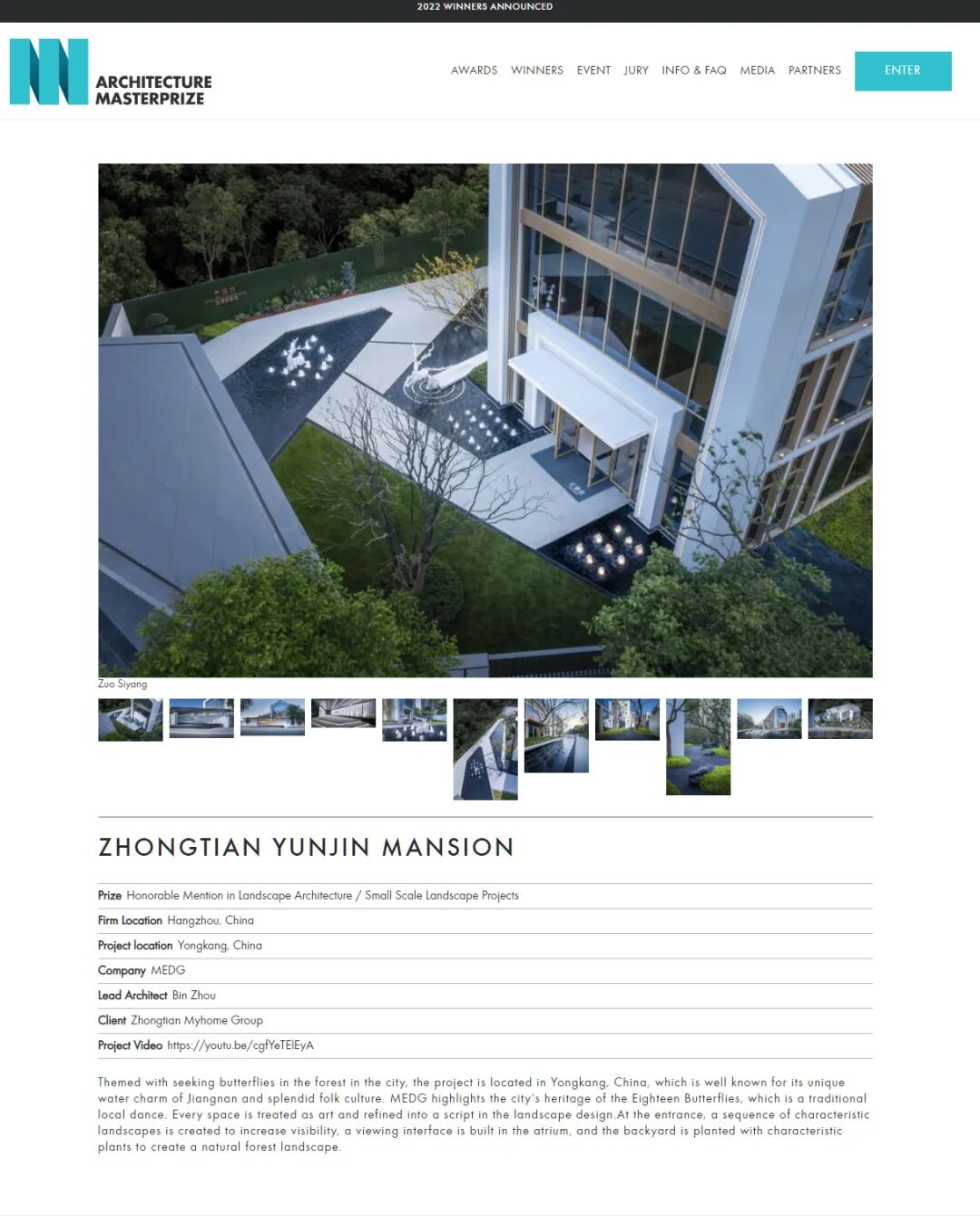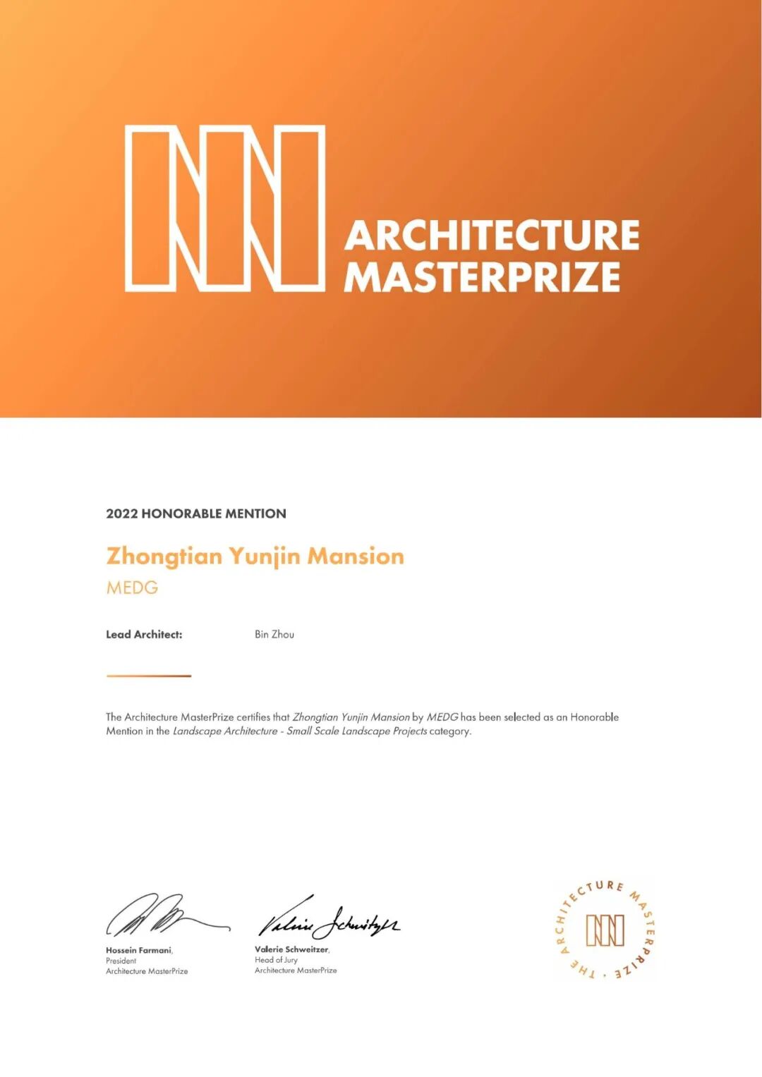 After strict review by AMP , the current design "Zhongtian · Yunjin Mansion" stands out from thousands of works around the world and selected as an Honorable Mention in the Landscape Architecture - Small Scale Landscape Projects category.