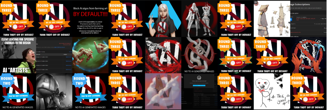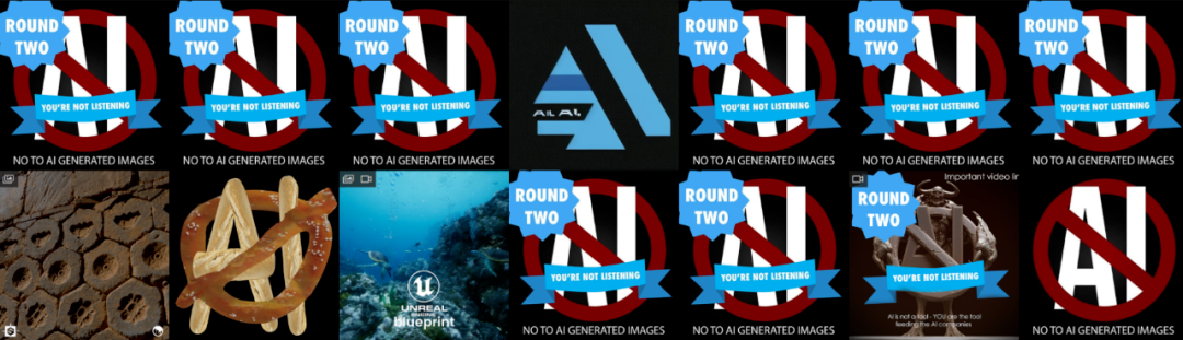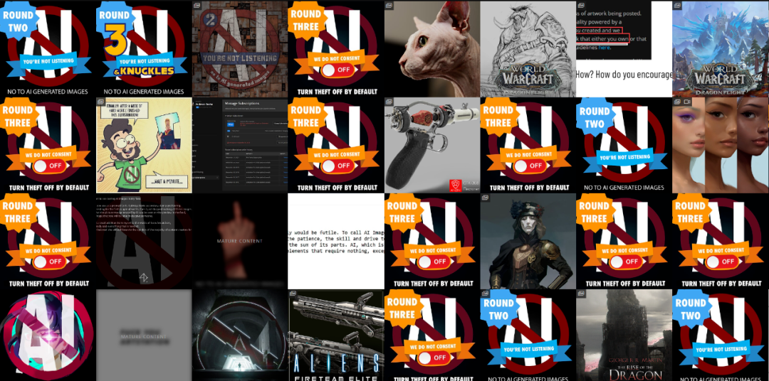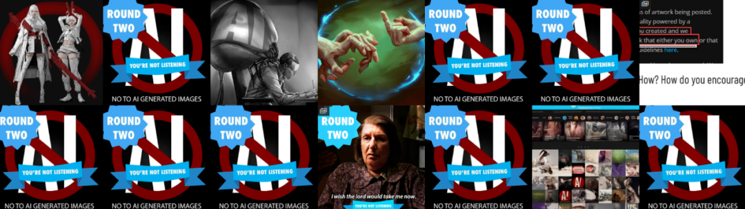 ArtStation(A站)是一家综合性质的视觉艺术网站。目前,这家网站的主页正在被铺天盖地的X给刷屏。各路艺术家将“反AI游行”升级到了“ROUND 2 和 ROUND 3”,并有明确的标签来区分。众多艺术家还删除了以往的作品,唯独保留了抵制AI绘画的海报,并且标明要退出A站。