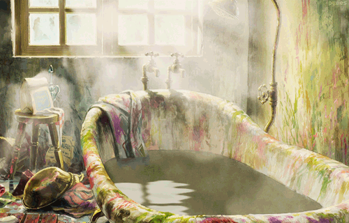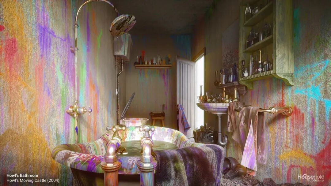 哈尔的浴室是他的私人空间。老式的铜管和水龙头反映了电影的蒸汽朋克机制,但爆炸性的染发剂污渍揭示了哈尔精心保养的外貌是一场骗局。事实上,在这样一个经典的浴室里,狂野而发光的油漆也起到了空间渲染的神奇功效。