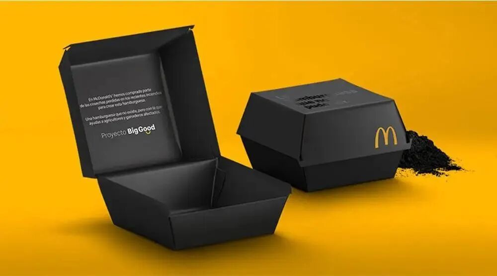 纯黑色的麦当劳汉堡盒你见过吗?其实,这是由于在今年夏天,西班牙很多地区发生大火,对耕地和牲畜造成重大损害。麦当劳特推出了这款“La hamburguesa que no pudo ser”(不可能的汉堡包),向全民募捐。汉堡盒的炭黑色来源于被大火烧毁的农场、牧场,盒子内部以白色字体,对该项目进行了详细解释。