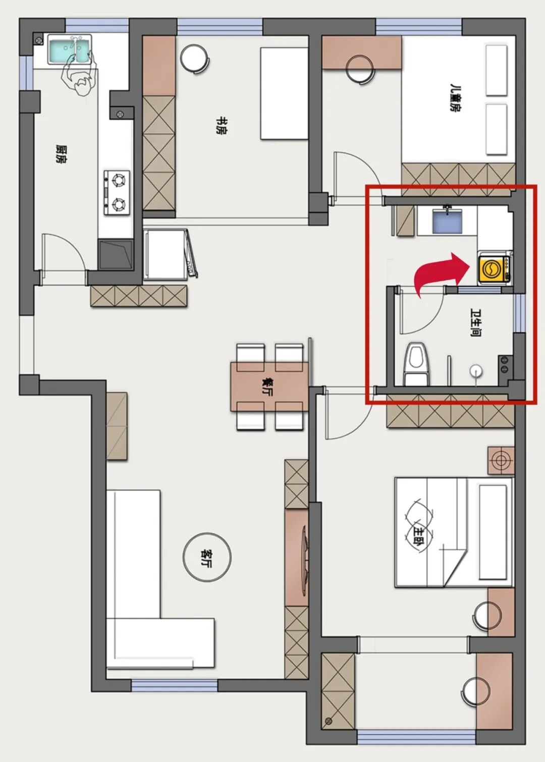 • 如果选择洗衣机+晾晒模式,则洗衣区在卫生间和阳台之间最合适