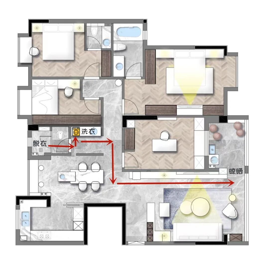 家务动线自然是越高效便捷越好。根据洗澡→洗衣服→晒衣服这一过程,最合理的动线应该为:卫生间→洗衣区。