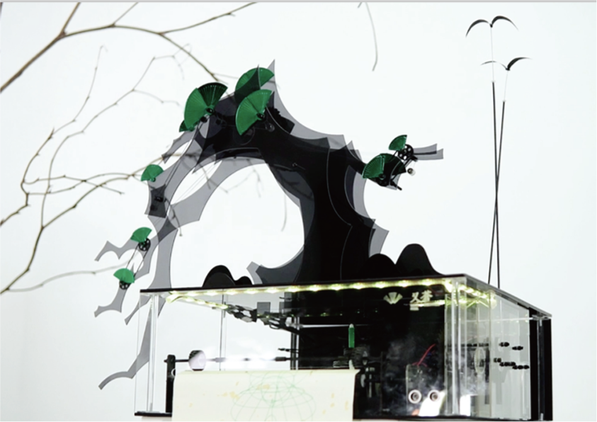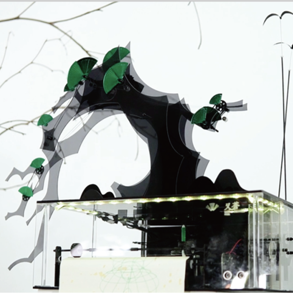 树本无声,意由景生。尝试与万物对话,与自然相融,这是大自然赋予我们生命最本真的意义。本装置利用超声波传感器触发,通过机械元件的带动,整体呈现出与人招呼的欢迎的姿态。同时触发纸轴滚动及画笔的运动,仿佛留下迎客松与人交流的痕迹,也呈现迎客松和平、热情、包容的寓意。我们希望在世界和平的前提下,将人与万物之间的关系变得更紧密。