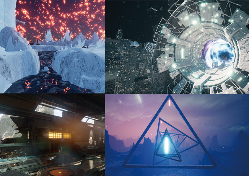 以梦境为灵感,借助虚拟现实技术让人们身临其境的感受现实中不能到达的地方。橙紫色的昏暗天空、崎岖的地面,还有在空中的巨大三角……你好像来到了一个不曾见过的地方……
