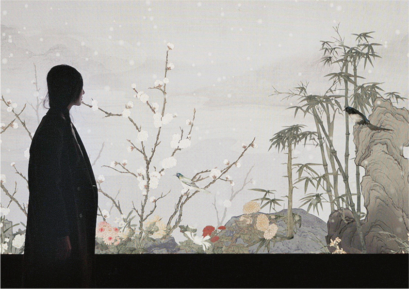 《飞鸟集》是一幅运用中国宋代花鸟画视觉语言再造的数字花鸟长卷,作品蕴含着“山气日夕佳,飞鸟相与还”的诗情画意,写意着天地万物和谐共生、万象自在的美好境界。长卷中富于文人画精神的自然图景会随着季节和天气的变化而实时演变,赋予了作品一种生命感,令画卷成为了大自然的诗意镜像;画面中形态各异的飞鸟意趣盎然地与现场观众互动,亦让作品成为了人与自然的交互界面。