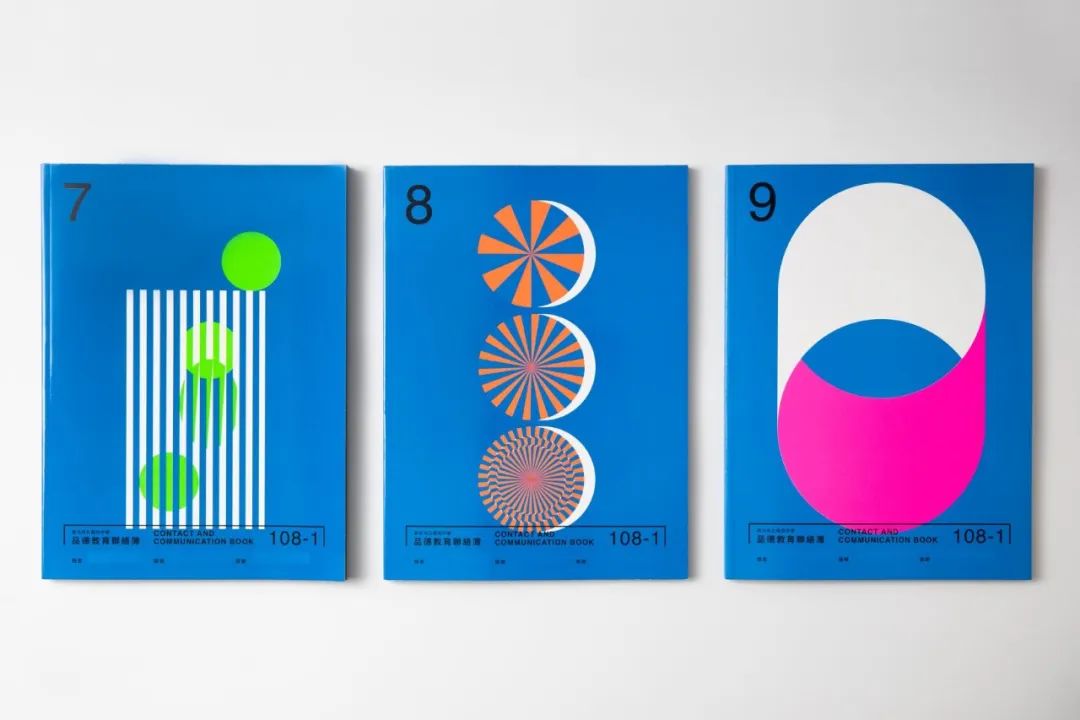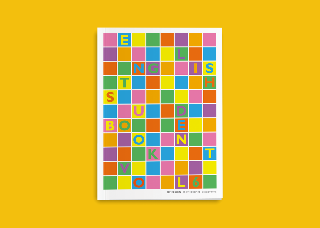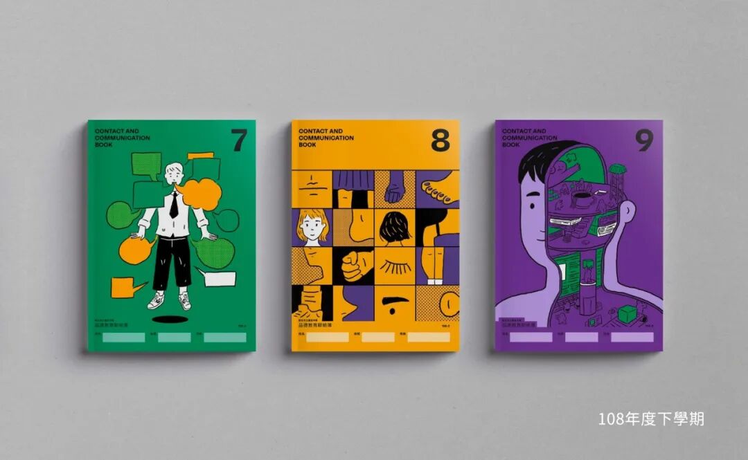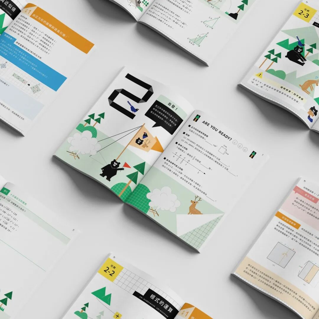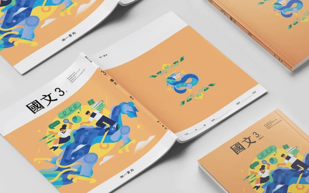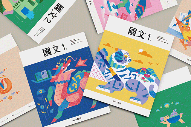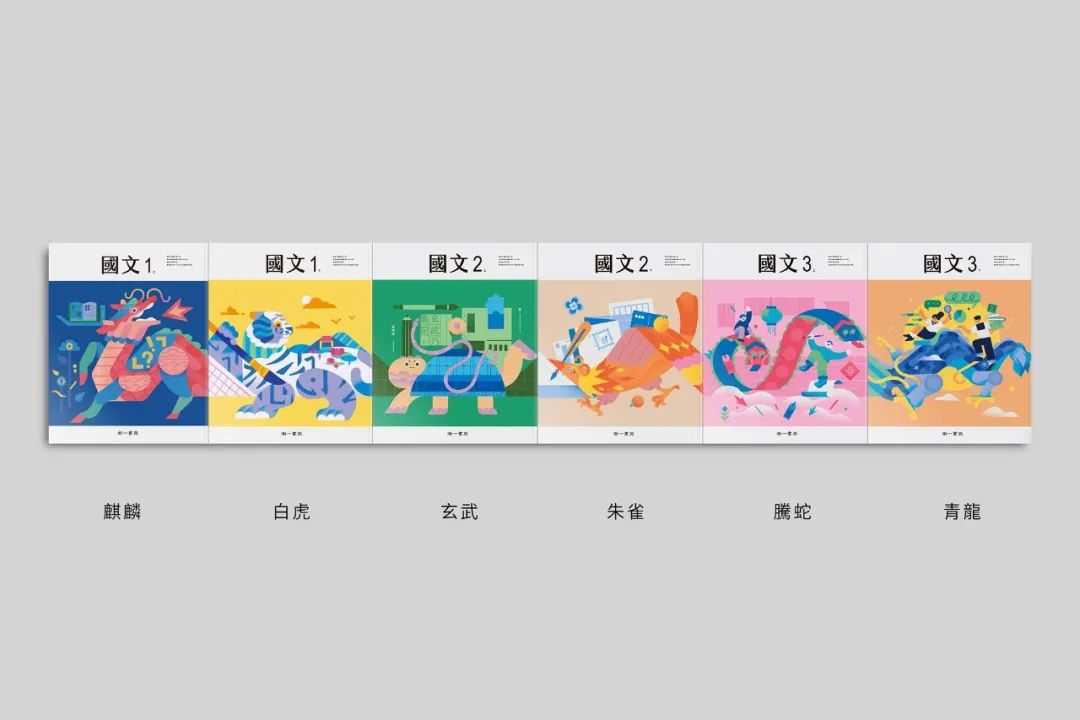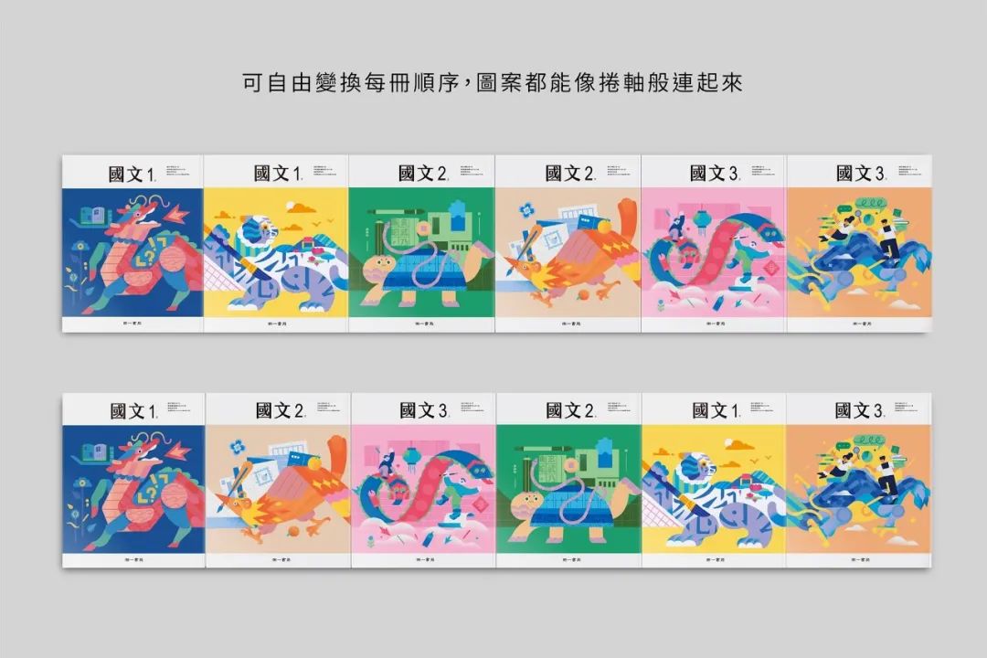 六册课本封面一字排开,可以发现每一册的视觉都能拼接在一起,宛如卷轴一般水平延伸,象征学无止尽。