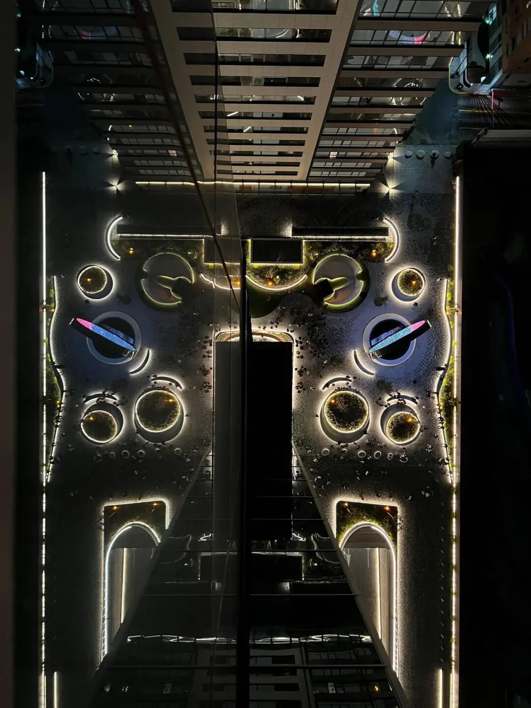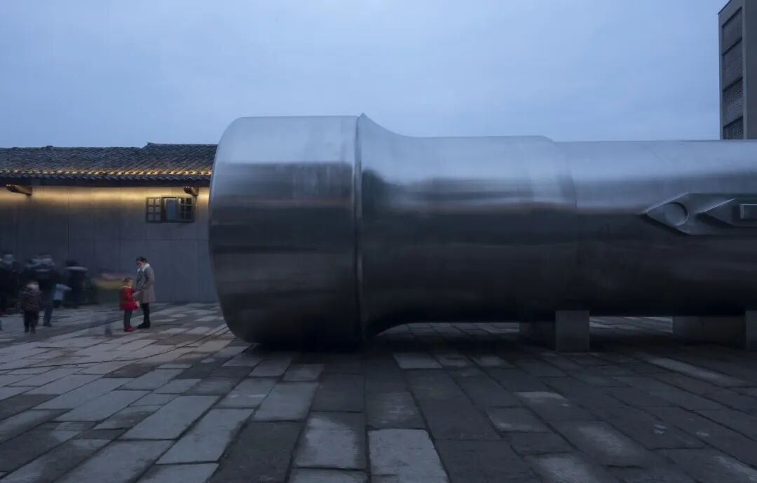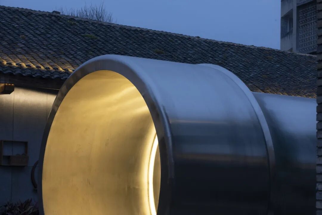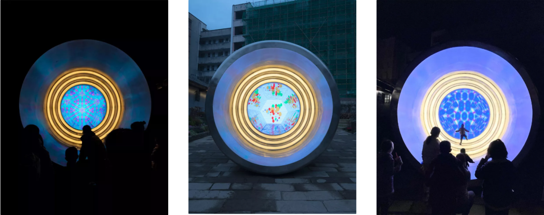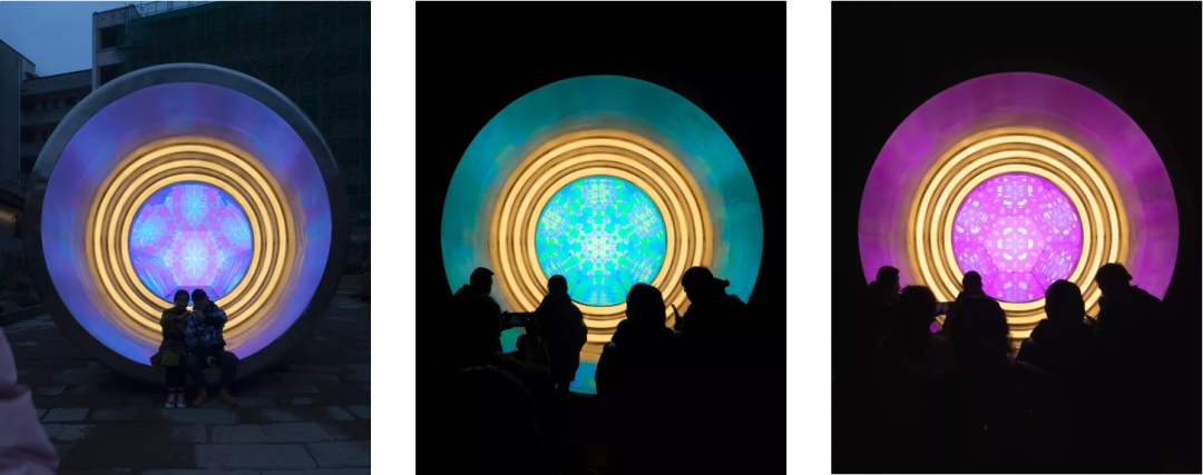 如何在纷繁的记忆中探寻那段时光?我们想到了童年用手电筒探寻黑夜的经历。「拾光万花筒」就是我们关于南川东街生活记忆的灵光。复古的老式手电筒作为装置外型,经过成倍放大之后,电筒内自然形成了可供停留的纵向空间。六块镜面不锈钢构成的内部空间,形成了光影往来间奇妙的折射关系。电筒内部尽头,以高清LED显示板封底。荧幕无穷变换的万花筒纹样,在镜面的折射下,形成无尽变换的斑斓色彩。纵深的内部空间,有较强的方向引导性。
