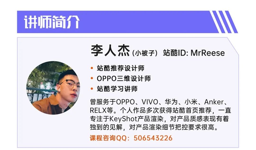 此外,小被子已经主讲了12期的KeyShot产品渲染训练营课程,教学经验丰富,授课风格生动幽默,善于引导学员,能做到一对一辅导作品。
