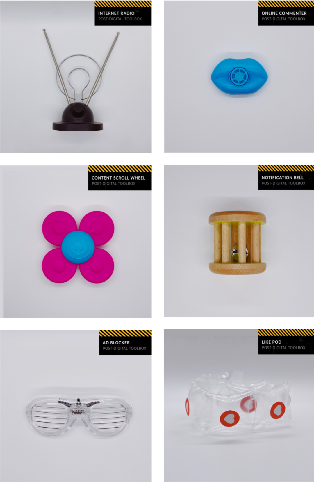 这个项目的指标来源于话语设计学科。从这个意义上说,这一项目涉及到了构建上下文环境以启动对话。其中的每个子项目都探讨了屏幕成瘾的荒谬性,唤起了一种诗意的不和谐,以促进数字福祉。这些子项目包括:Post Digital Toolbox, Tiktok Book, Daily dose of internet & Faraday Umbrella。