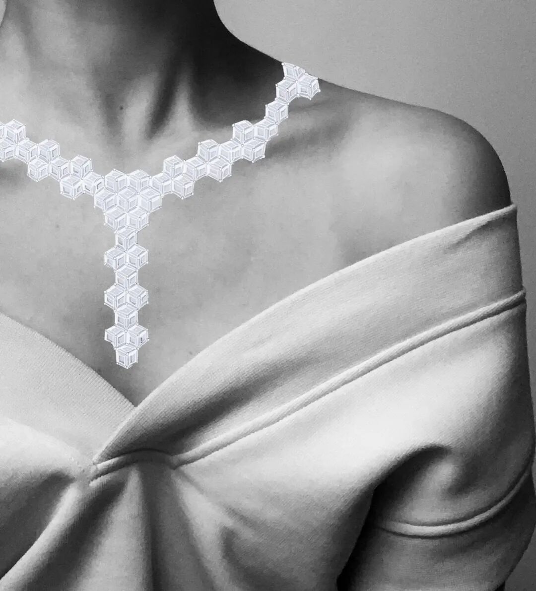 “这个系列的作品由 18ct 白金中的多面元素组成,镶嵌菱形切割和梯形钻石,这些钻石悬挂在精致的链条上,并以几何排列方式连接在一起。”