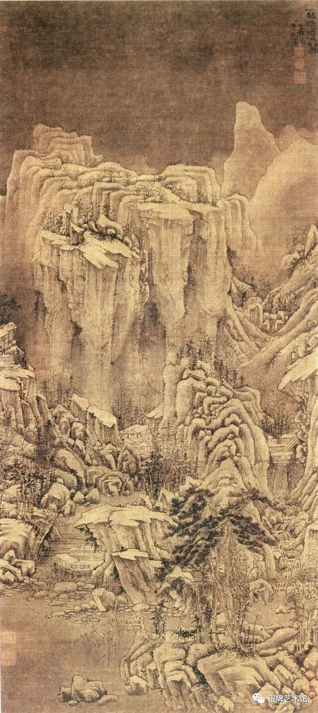 图中描绘崇山峻岭均为积雪覆盖,崖头隐约地点缀着短小的丛树,山谷间有林木、水榭掩映。雪雾烟岚在崖隙间弥散,山脚下,长松依然清翠昂然,整个画面散发着荒寒萧索之气。