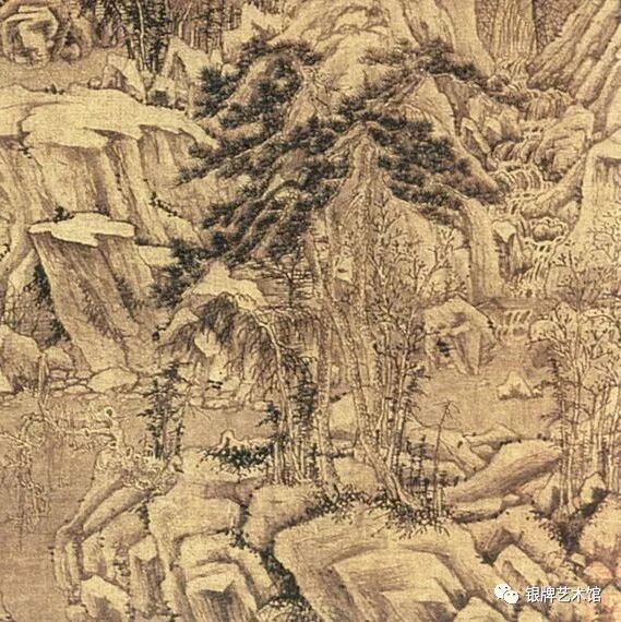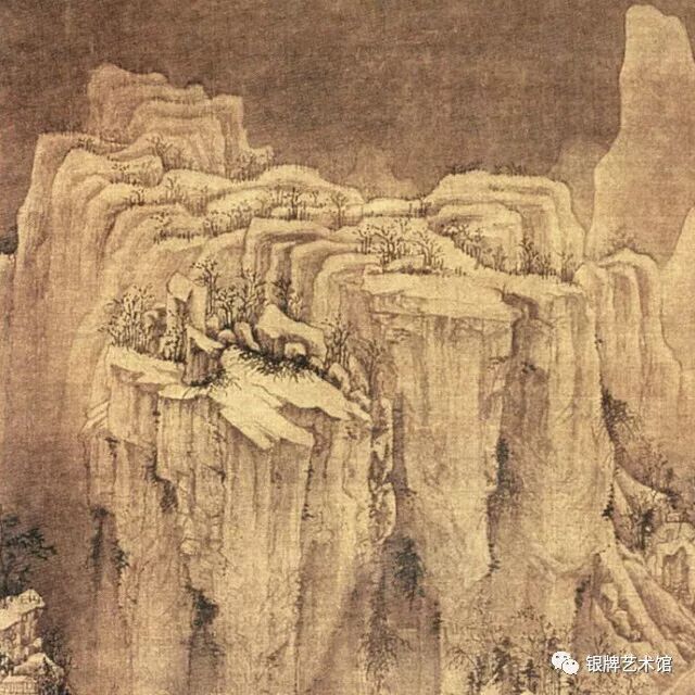 这种雪景的画法完全师从黄公望《九峰雪霁图》,画家利用绢素洁白的质地,以淡墨烘染出天空、水面,以墨笔淡淡勾出景物轮廓,显现出雪景的晶莹透明。