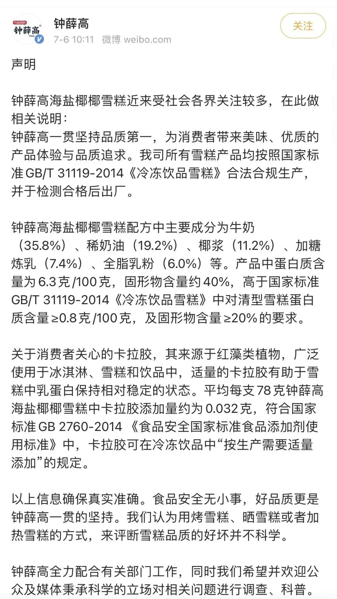 7月2日,#钟薛高31度室温下放1小时不化#话题登上微博热搜,相关阅读量高达10亿+,有关“雪糕不化是否涉及添加剂过多”的质疑,很快引发轩然大波。