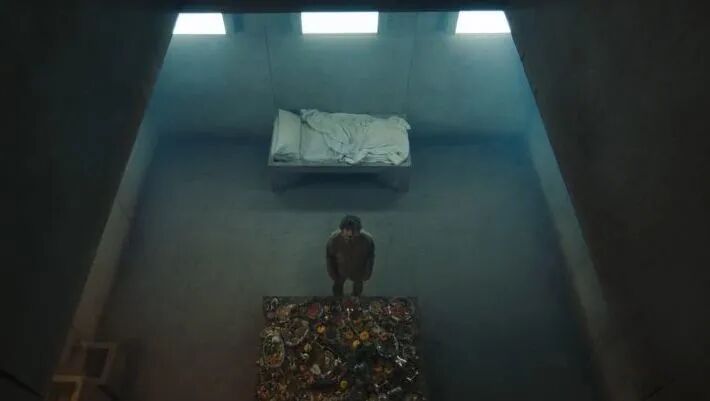 而另一部电影《饥饿站台》,被戏称为“横向的雪国列车”。电影讲述了一个333层监狱的故事,这里每层2个人,要么自愿,要么犯罪被送进来,每层待一个月后会被随机换到其他楼层。