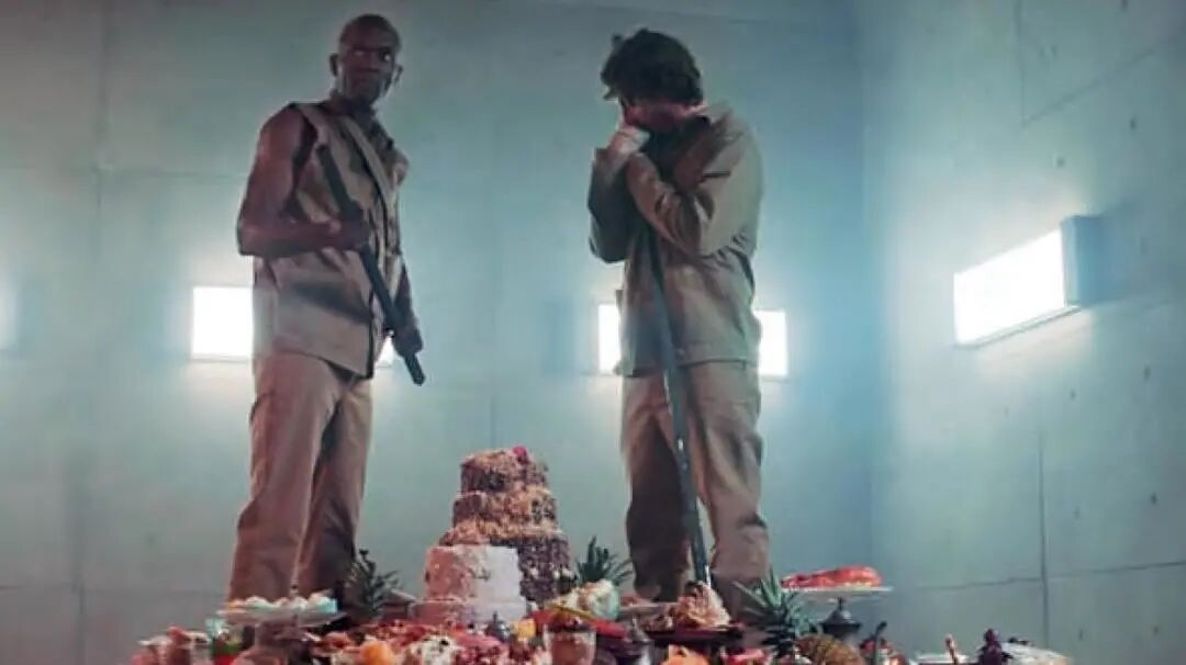 《饥饿站台》的结尾,男主随着餐桌,带着武器和堂吉诃德式的壮烈从上而下的推行”团结“革命,希望实现食物的平等分配,让大家能够活下来。
