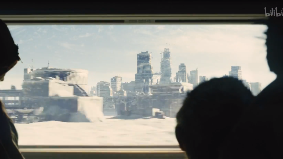 车厢外,皑皑白雪覆盖了曾经人们赖以生存的城市,如今已成为了文明的荒原