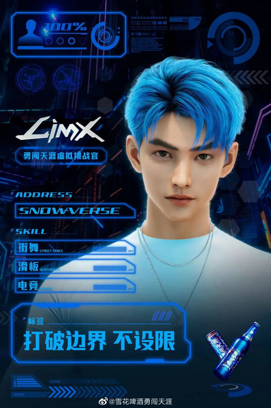 2005年,雪花啤酒推出勇闯天涯,时至今日,勇闯天涯始终以年消费者精神层面诉求为核心,所以目前在深受年轻人关注的元宇宙领域也开始进行布局,作为传统企业的雪花啤酒,虽然身为传统消费品领域,但始终以敢于挑战、年轻无畏的精神诠释着品牌形象,在元宇宙行业爆发性发展的过程,雪花啤酒也根据具品牌特性量身打造了虚拟数字人LimX,以领先与行业的步伐踏入元宇宙的大门,为与Z时代在未来的对话打下基础;