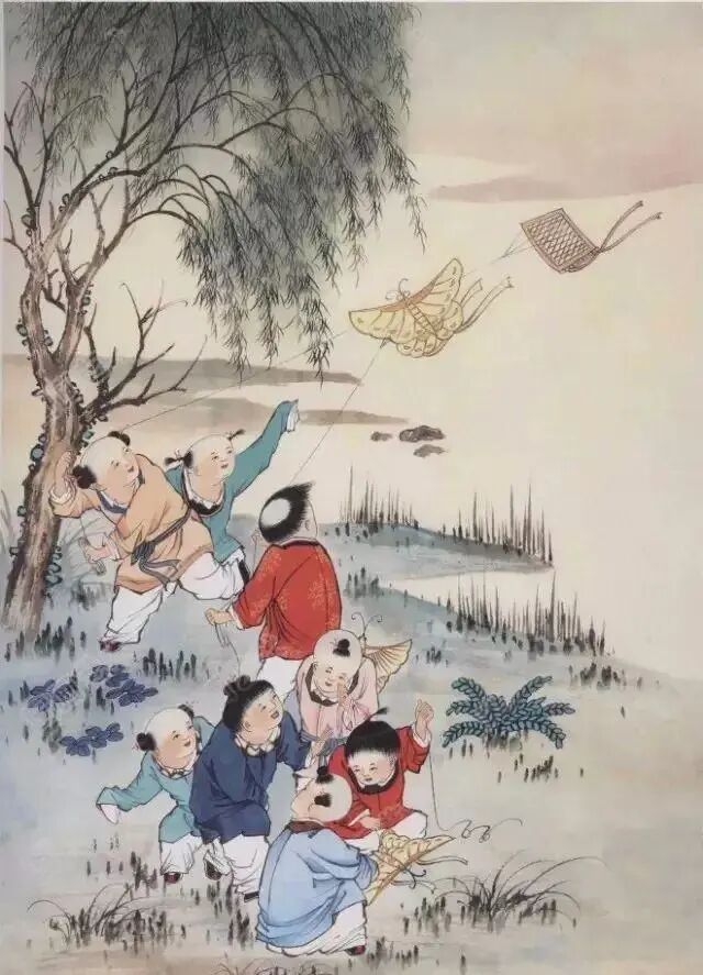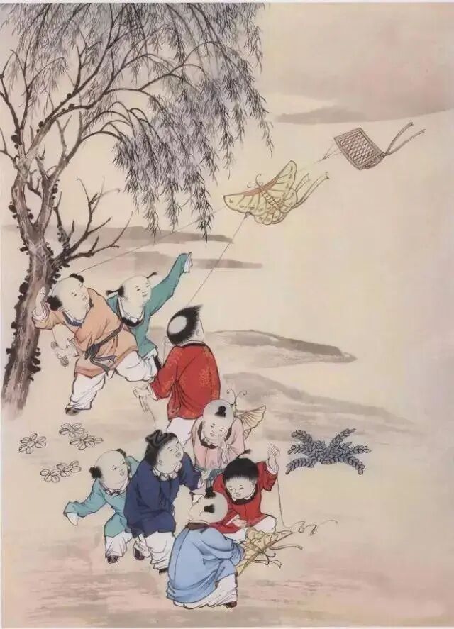 2.用藤黄、花青、石青、胭脂、大红等色分别平涂孩童服饰,用淡花青分染孩童头皮、柳树树叶、夹叶。以花青墨为蓝色衣服分染层次,赭石墨为黄色衣服渲染。用藤黄、鹅黄加白给红色衣服画花纹。蝴蝶风筝先平涂藤黄后局部平涂赭石,鱼鳞风筝平涂淡赭石。