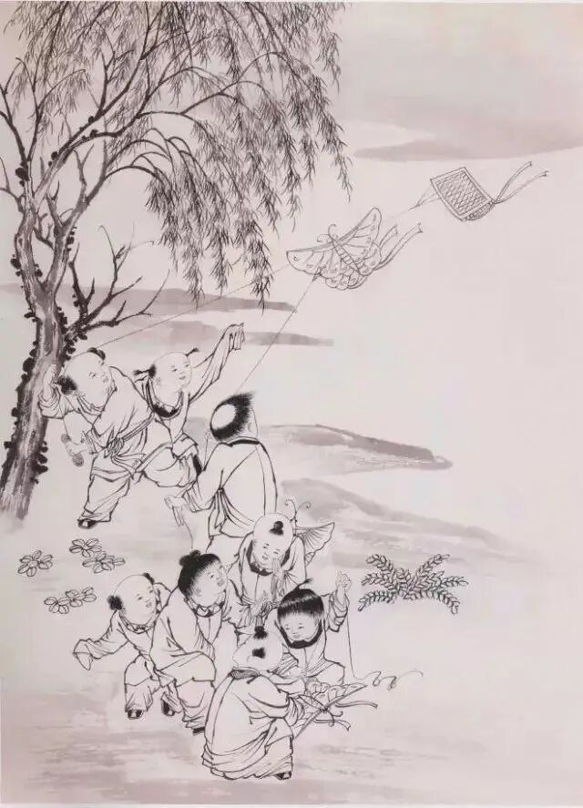 1.用重墨勾衣纹、头发、眼睛、眉毛、夹叶、树干并点苔,中墨画风筝、柳叶并分染头发,用淡墨皴擦树干并画堤岸。