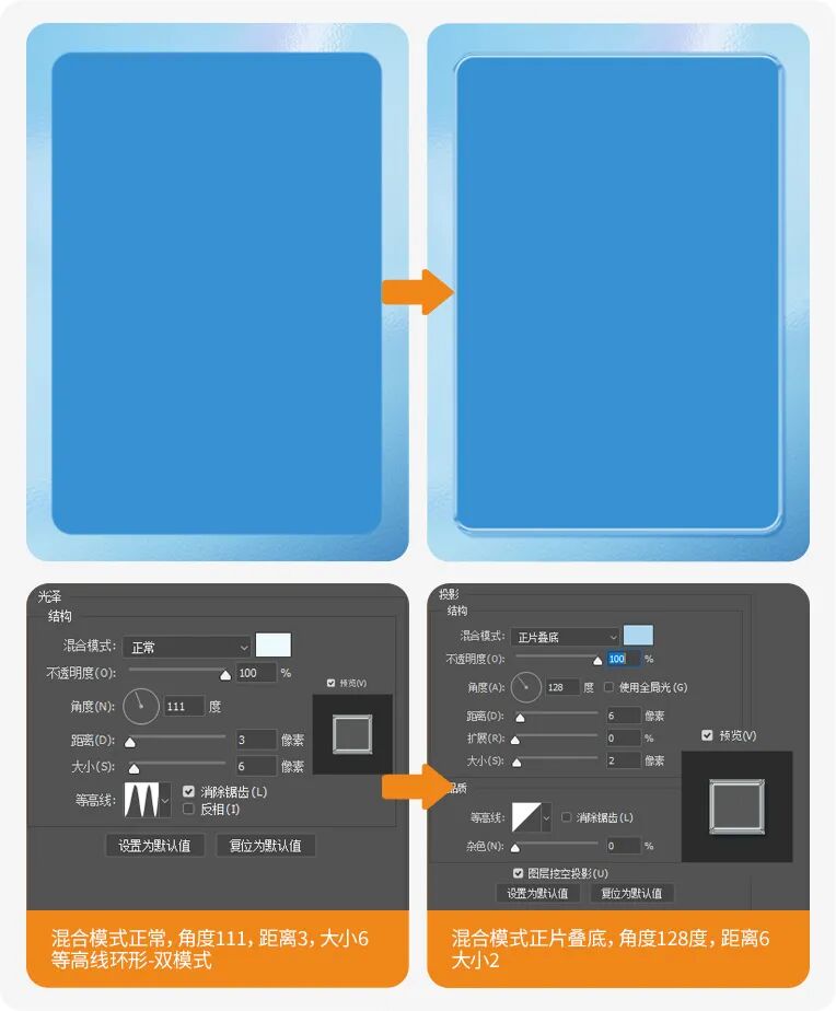 02.再绘制一个稍大的圆角矩形(淡蓝色)置于底层,双击添加图层样式-斜面浮雕-内发光-光泽