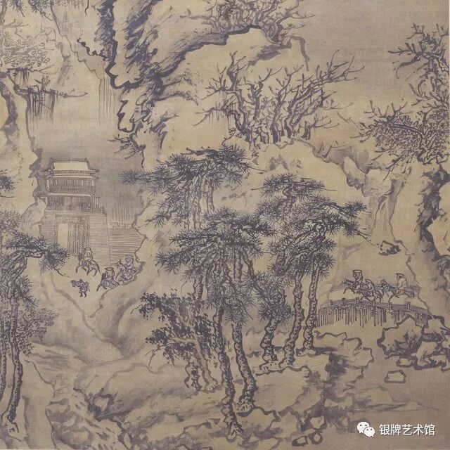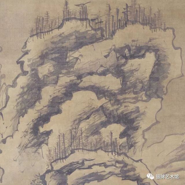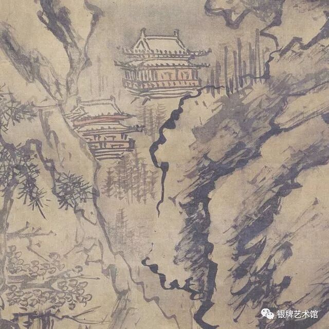 全景构图,画山石笔墨放纵,线条外形多变,侧中锋兼用,画树木则硬笔刚线。