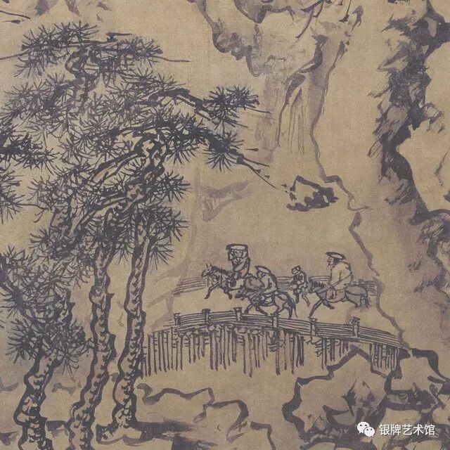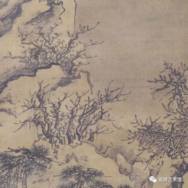 《雪景山水图》图中山峰峻拔,岩石硬厚,山峦白雪皑皑,丛树凋零,近景高大松树苍郁挺立。
