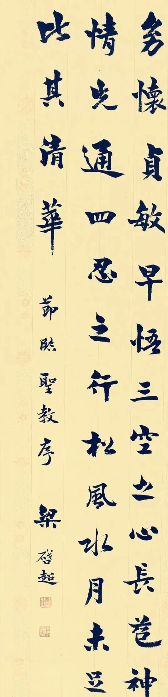沙孟海后来是怎么做的呢?据沙孟海先生回忆:在一次偶然的机会,看到了梁启超临写的《圣教序》,结体逼近原贴,用笔更加方硬,从此参用此法写王字,面目为之一变。