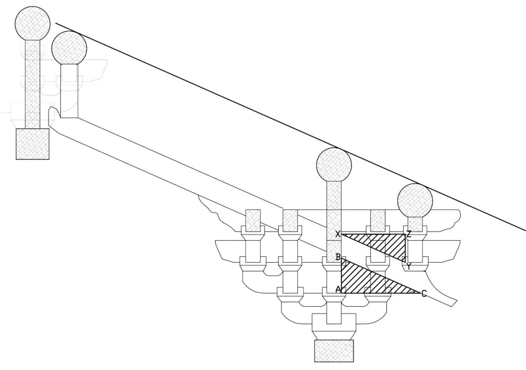 下昂设计相关测值共计12组,数据有限,仅剔除明显偏差数值后进行简单的算术平均运算,计算结果为昂真高约185.7毫米,与前文算得的单材高近似,昂斜高204.5毫米,约为真高的1.1倍。华头子三角形与耍头三角形的斜度接近,下昂斜度约为四五举。