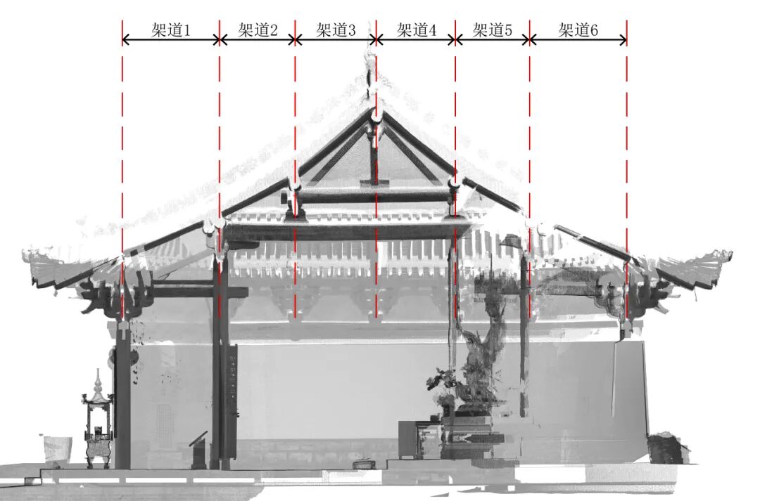 毗卢殿为歇山顶的六架椽屋,各缝架道均为四椽栿前后劄牵的形式。理想状态下,架道水平长度应测量槫条轴线的间距,但由于槫条形状不规则,且建筑结构变形明显,多处槫条有外翻现象,故采用内外檐斗栱及襻间斗栱的泥道栱外皮间距代替。自南向北分别以架道1至架道6代指前檐柱心至前金柱心、前金柱心至上平槫、上平槫至脊槫、脊槫至上平槫、上平槫至后金柱心、后金柱心至后檐柱心几段距离(图6,实测表略)。