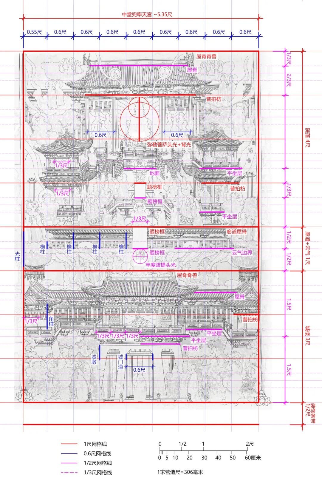 竖直方向上,中堂兜率天宫使用0.6尺/6寸的网格统筹结构要素。墙面减去条屏和装饰带后宽约5.35尺(1640毫米),无法沿用1尺的网格。画面被分成9 份,其中最左侧一格稍窄,约为5.5寸,其余八格均为6寸整。这应是受到画面宽度的限制,采用了从右向左按照固定模数划分网格并在最左一格做出调整的处理方法。格线契合了大部分重要的竖向建筑结构线。如中部连廊共七开间、每间均与网格线对应。下部城楼城墩宽3格,正中城门道宽1格。上方三开间大殿占5格,殿前踏道各占1格,左右稍间各宽6寸。