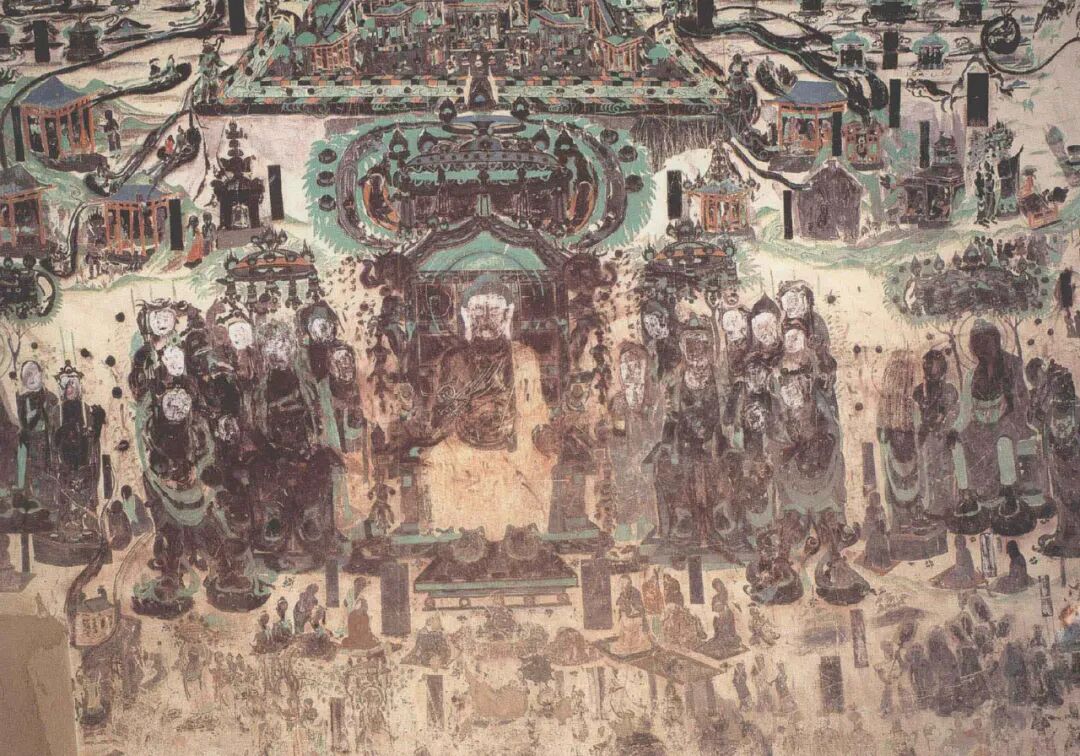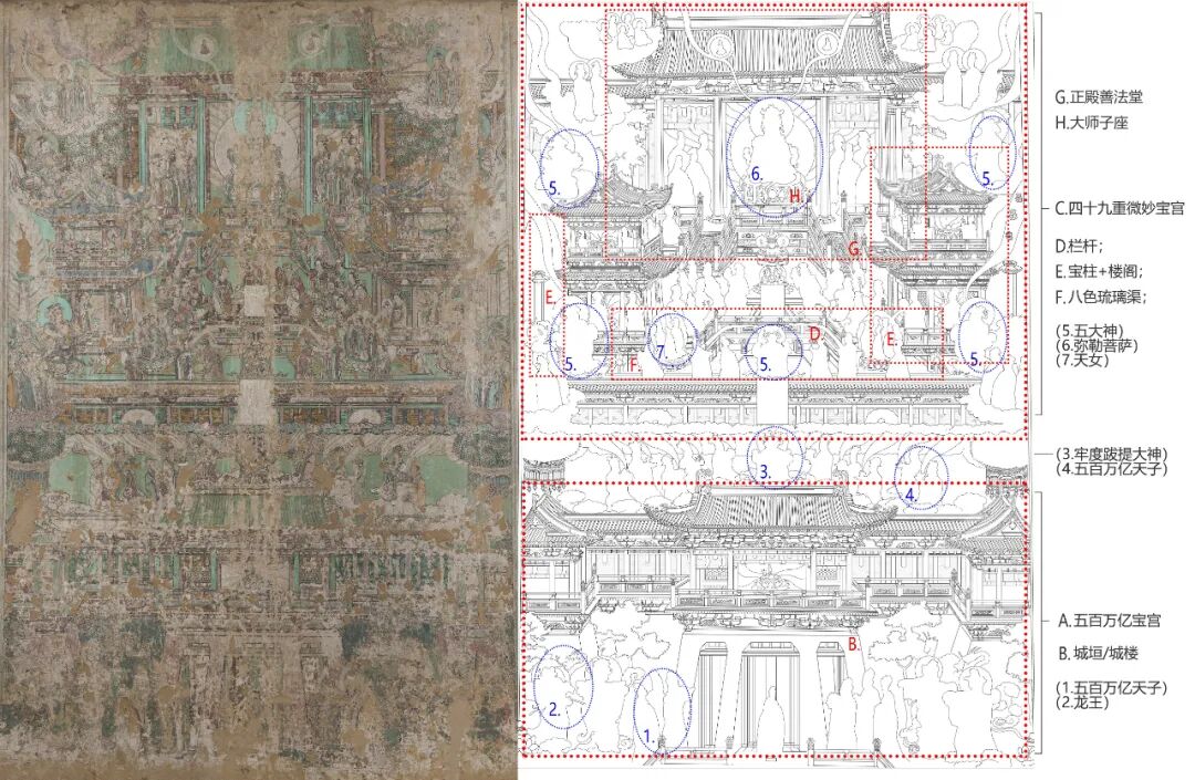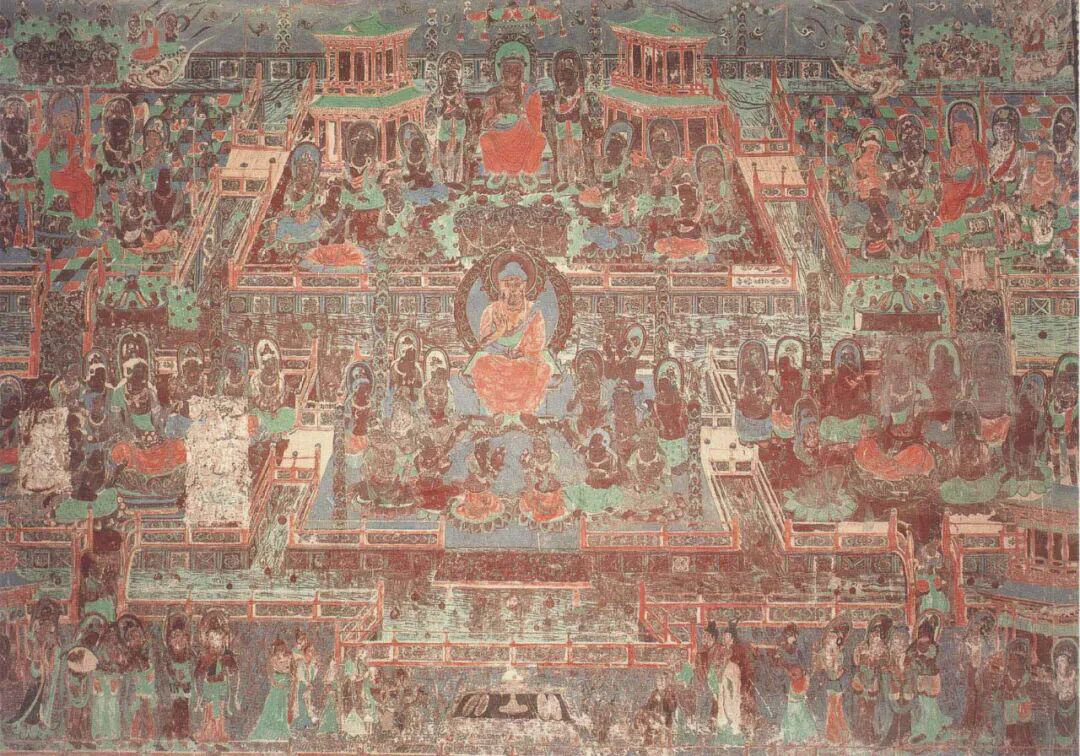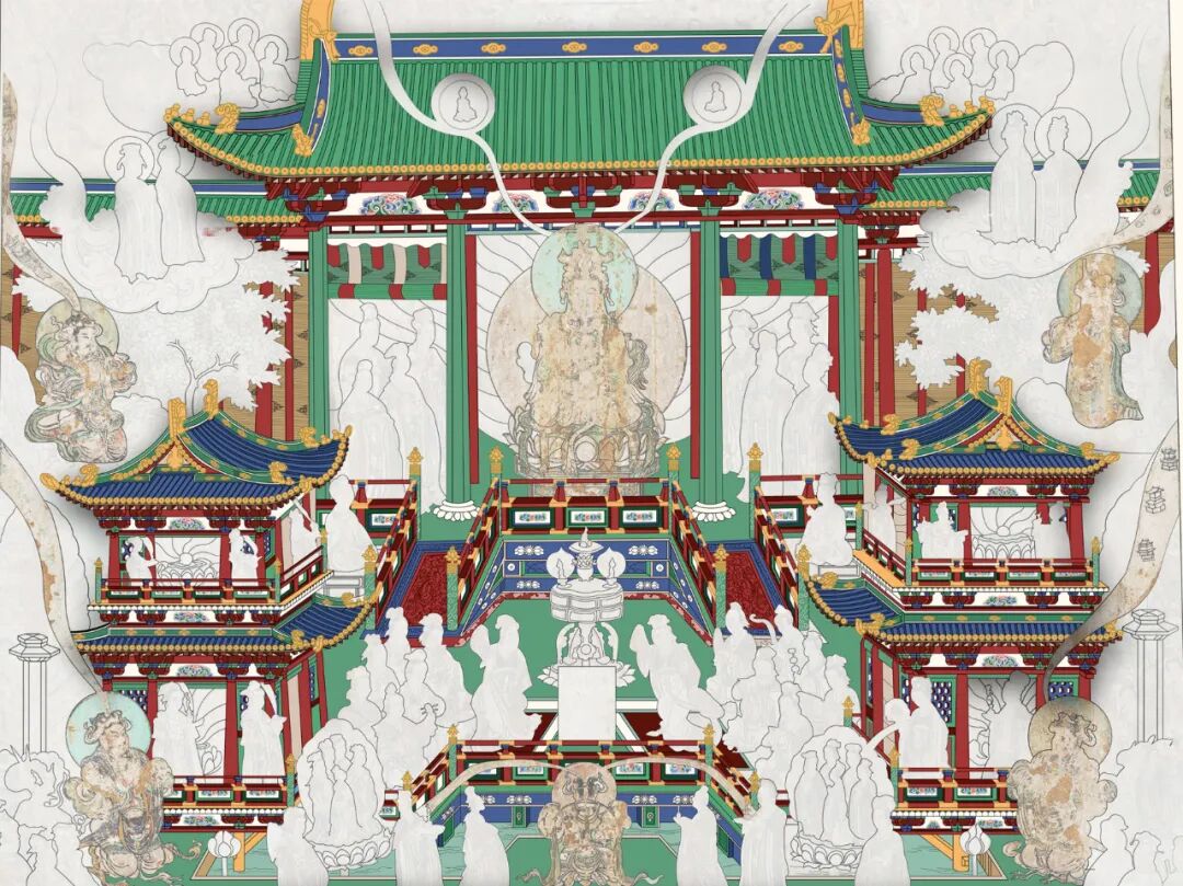 网格控制了这幅经变画的整体构图和建筑立面,图像空间的进深则是由建筑的侧面来表现的。画面以表现建筑正立面为主,同时用倾斜的侧面表达进深关系,中轴两侧的斜线设置基本对称,强化了画面空间要素向中轴汇聚的感觉。