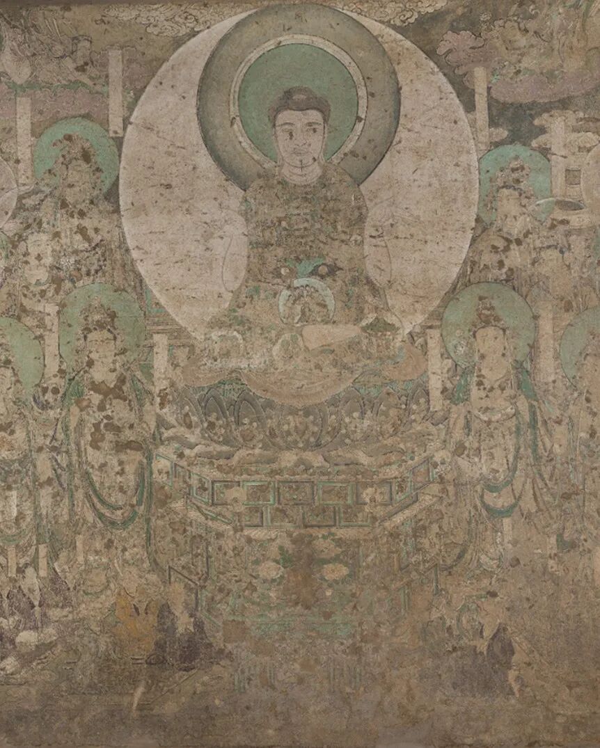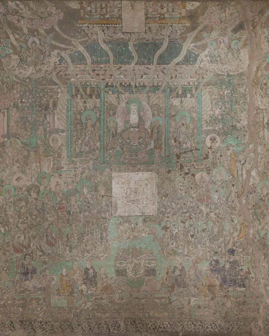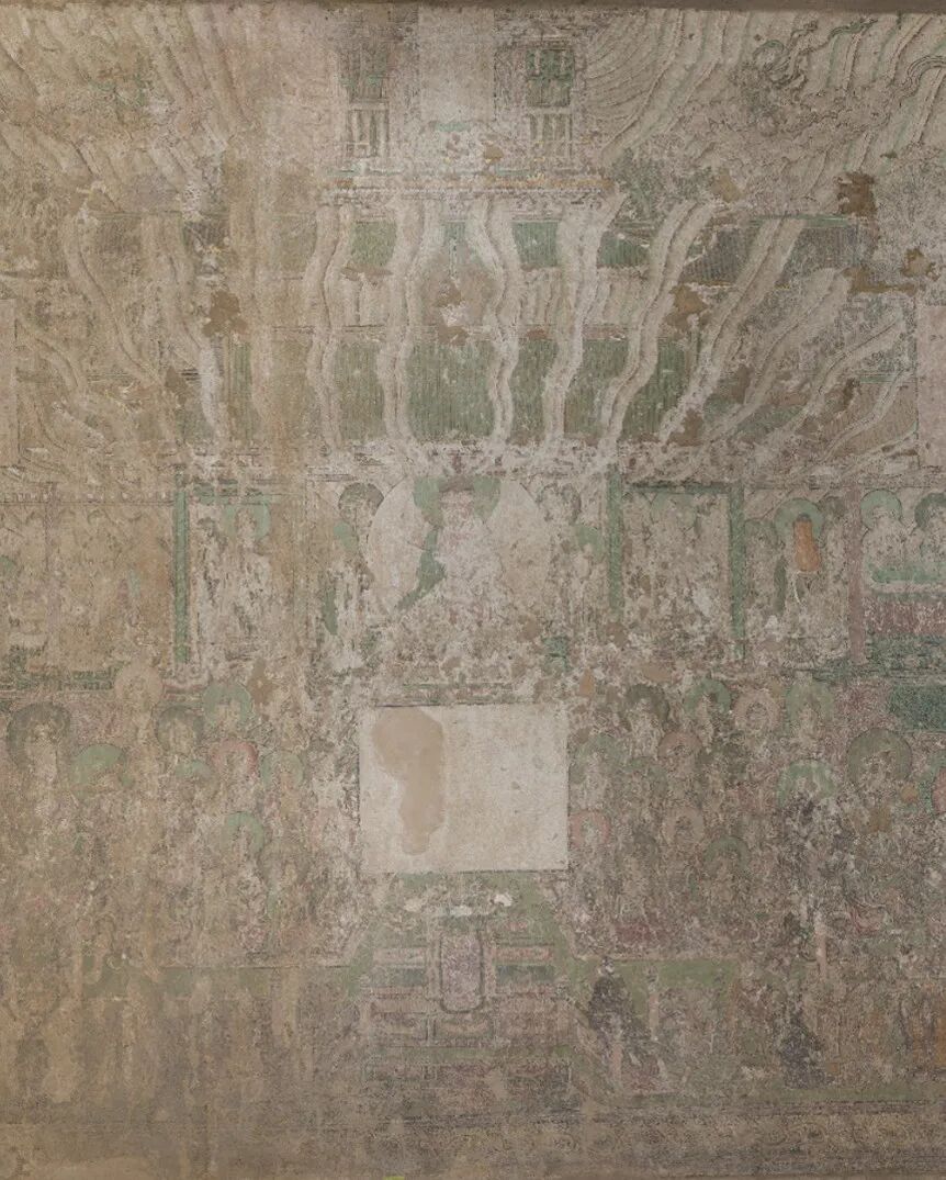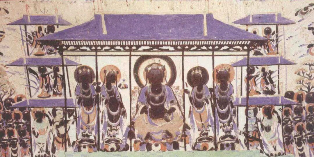 网格控制了这幅经变画的整体构图和建筑立面,图像空间的进深则是由建筑的侧面来表现的。画面以表现建筑正立面为主,同时用倾斜的侧面表达进深关系,中轴两侧的斜线设置基本对称,强化了画面空间要素向中轴汇聚的感觉。