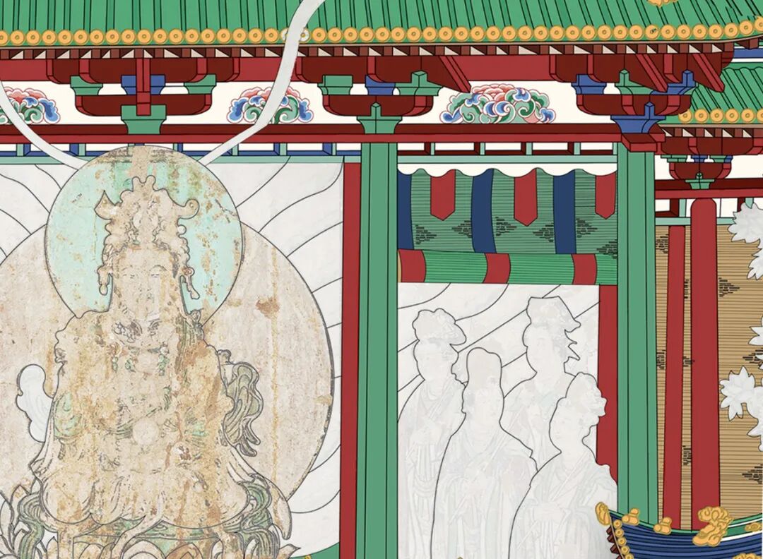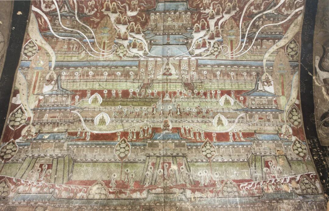 画面中建筑的表现方式暗示了空间的连续和不断递进,从北壁东开始空间推进的方式也发生了改变。西壁的片段均表现为同一方向的建筑侧面,即只有建筑的右侧面,显示出很明显的方向性。所有建筑图像都随着故事向右展开,引导观者不断向右行进,强调了大殿中顺时针方向的观看顺序。而从北壁东和东壁开始,画面中的建筑使用了纵深感强烈的中轴线,自下向上以空间的进深表现一层一层向上展开的天宫。在西壁的凡俗世界,观看或修行的方向曲折向前,通过北壁东兜率天宫的大门后,观看或修行的方向就变为了层层深入。